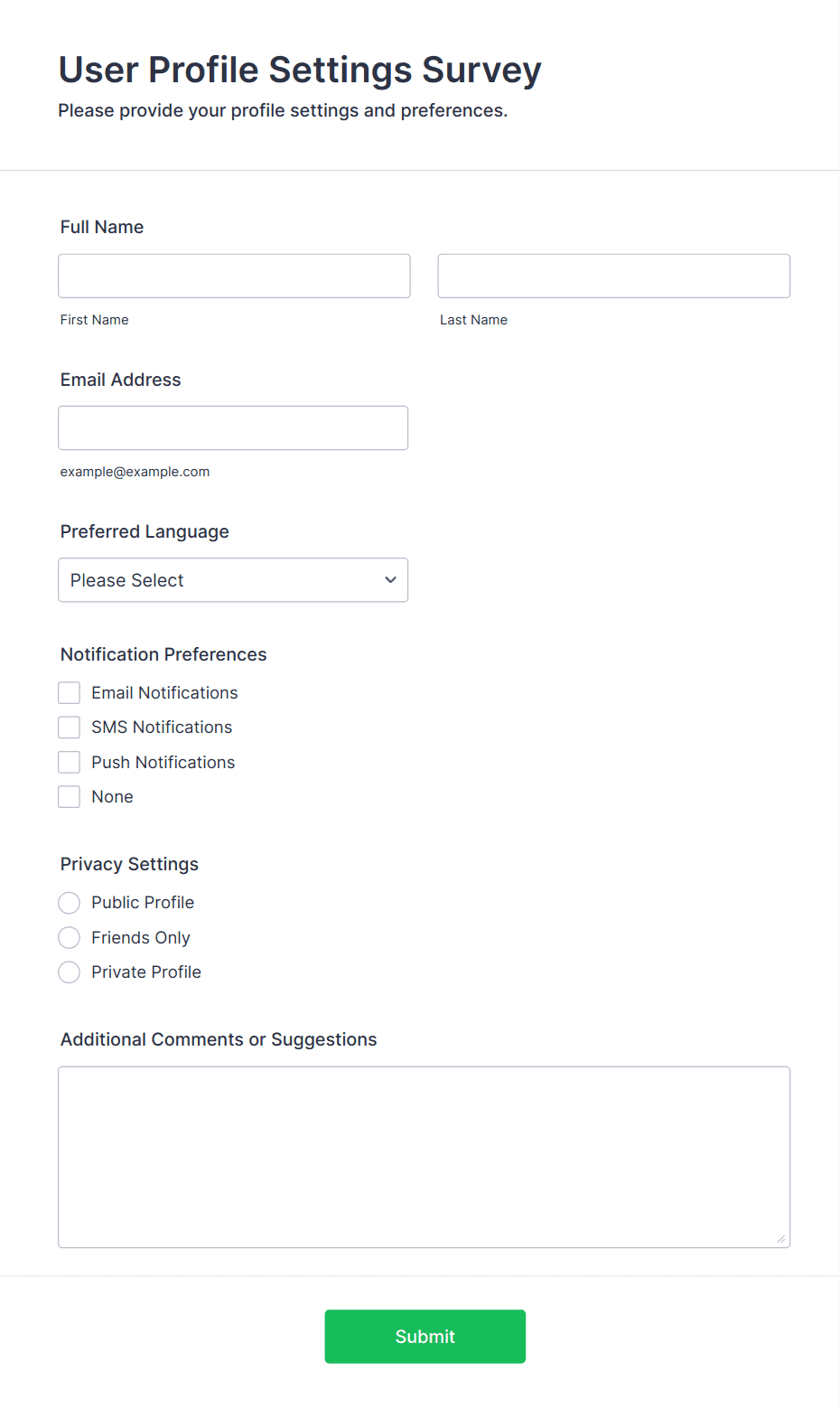 Survey templates are pre-designed forms that help individuals and organizations collect feedback, opinions, or data from a target audience. These templates are widely used for a variety of purposes, such as customer satisfaction surveys, employee engagement assessments, market research, event feedback, and academic studies. By providing a structured set of questions, survey templates streamline the process of gathering valuable insights, making it easier to analyze trends, measure satisfaction, and make informed decisions. Whether you’re a business owner, HR professional, educator, or researcher, survey templates offer a quick and effective way to reach your audience and collect actionable information.