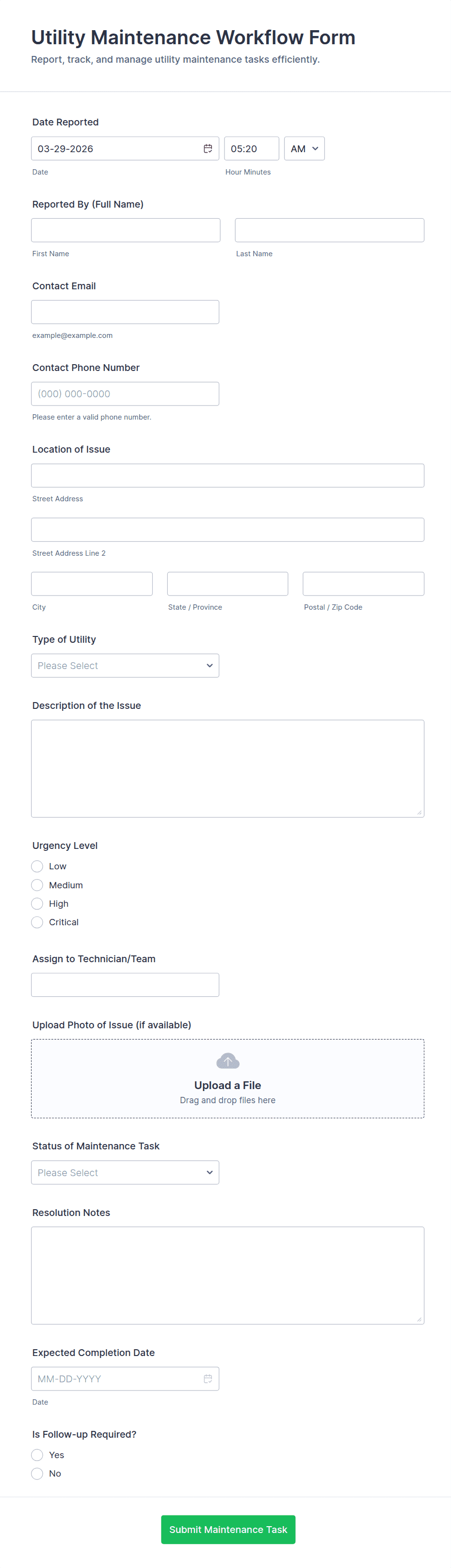 Typical fields include requester details, description of the issue or task, location, urgency, supporting documents, and preferred completion date.