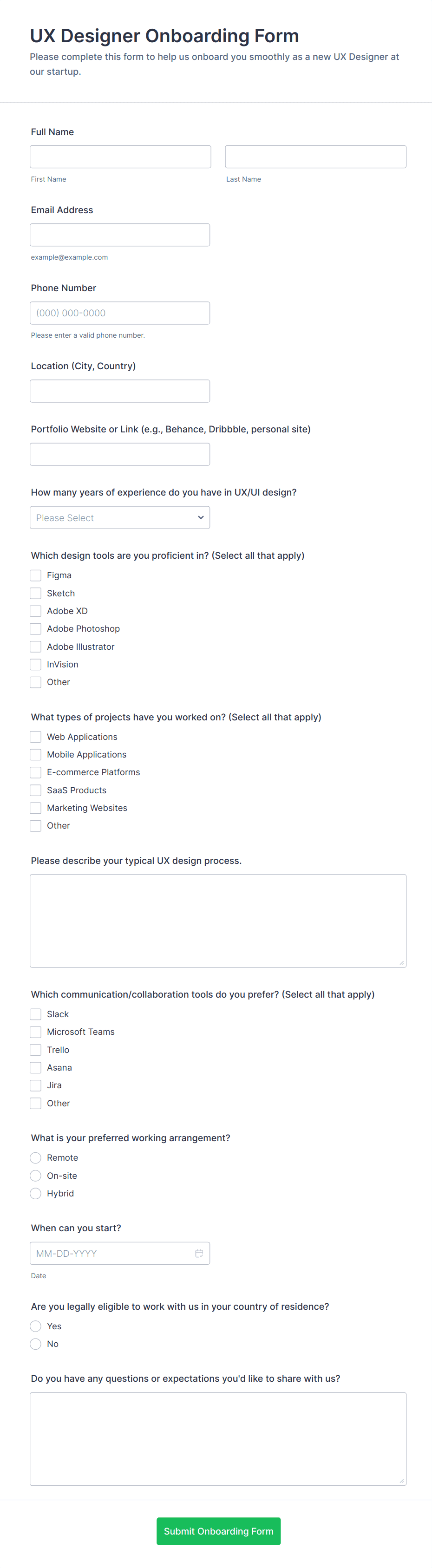 Onboarding Form Templates are specialized digital forms designed to streamline the process of integrating new employees, clients, students, or members into an organization or program. These templates help collect essential information, set expectations, and ensure a smooth transition for newcomers. Common use cases include employee onboarding, client intake, volunteer registration, student enrollment, and vendor onboarding. By standardizing the onboarding process, these forms help organizations gather necessary data, provide important resources, and establish clear communication from the very beginning.
