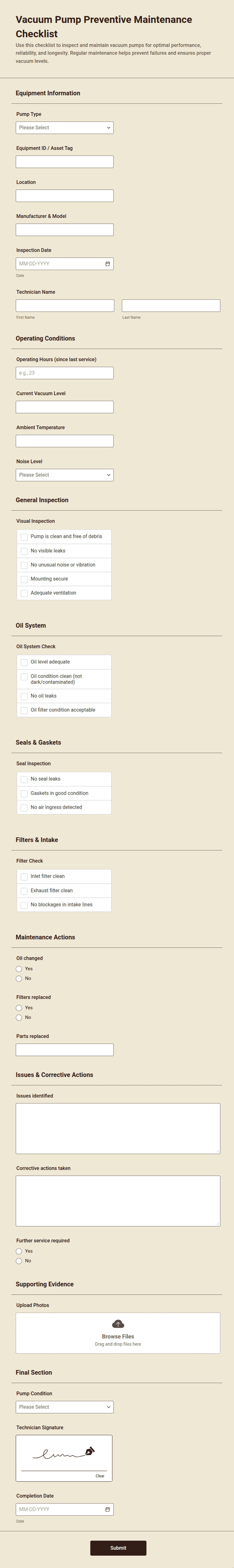 • For more complex checklists, add dropdowns, file upload fields (for attaching evidence or reports), or signature fields (for verification).