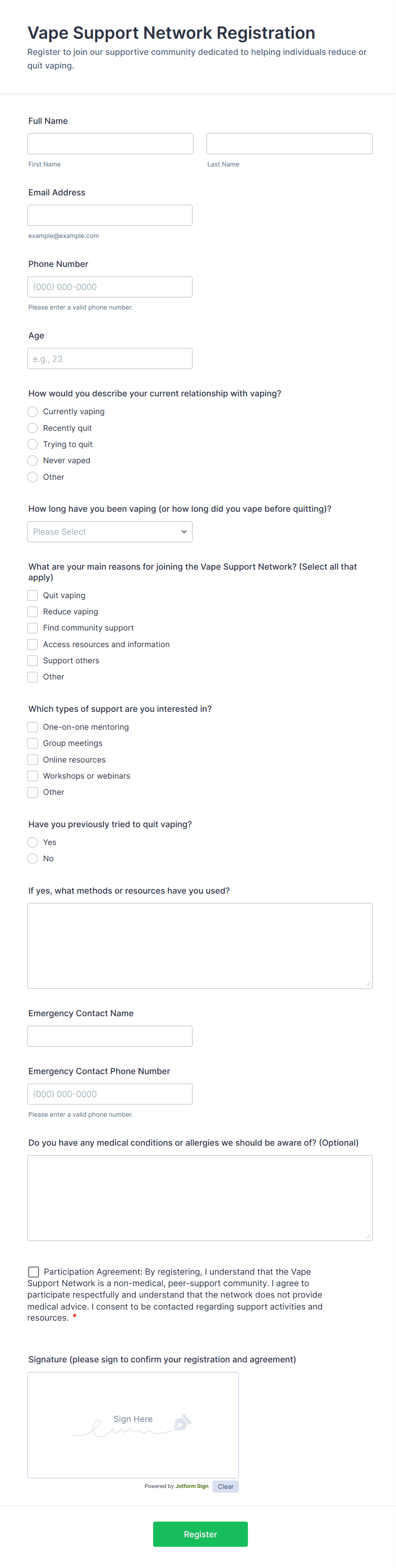 - Volunteer Sign Up: Can include availability, skills, and emergency contact fields.
