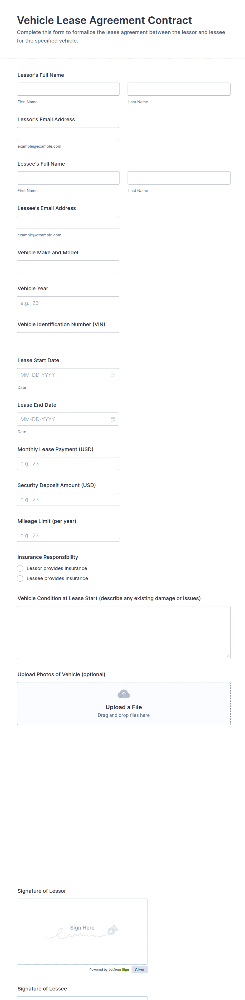 The form templates here are for informational purposes only. Jotform is not providing legal, financial, or other advice, or implying that the forms are legally valid in all or any jurisdictions. Before using any such form, consult an attorney and/or other applicable professionals to make sure that the form meets your needs, legally and otherwise.