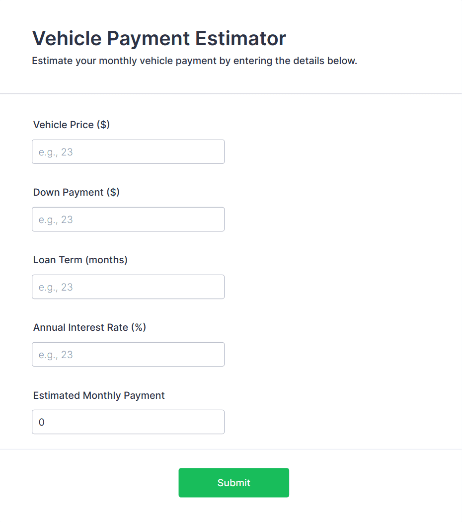 Collect and generate estimates for clients requesting your services. Calculate total costs automatically. Easy to customize, embed, and integrate. No coding.