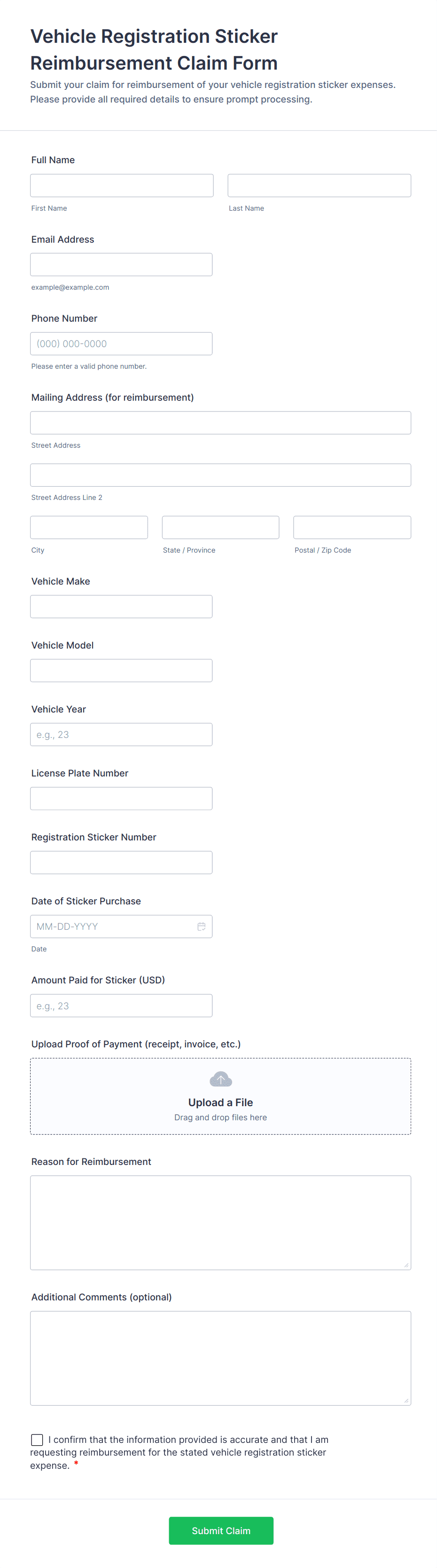 Collect and track sticker reimbursement requests with the Vehicle Registration Sticker Reimbursement Claim Form, ideal for employers and fleet teams that need consistent documentation and faster review of vehicle expense claims.
