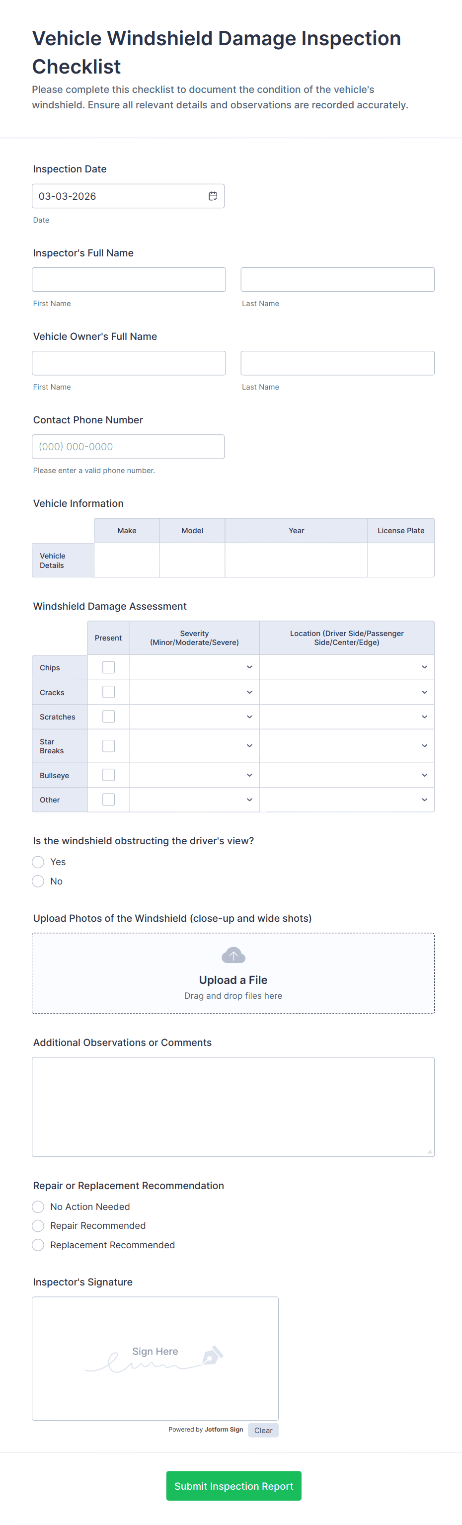 With Jotform, users can easily create, customize, and manage Vehicle Inspection Forms online without any coding knowledge. Leveraging Jotform’s intuitive drag-and-drop Form Builder, users can add fields for vehicle details, inspection checklists, photos, signatures, and more. The platform’s extensive template library and integration options streamline the data collection process, making it simple to store, organize, and share inspection results. Whether you’re managing a large fleet or conducting occasional inspections, Jotform’s features ensure efficient, accurate, and accessible vehicle inspection workflows.