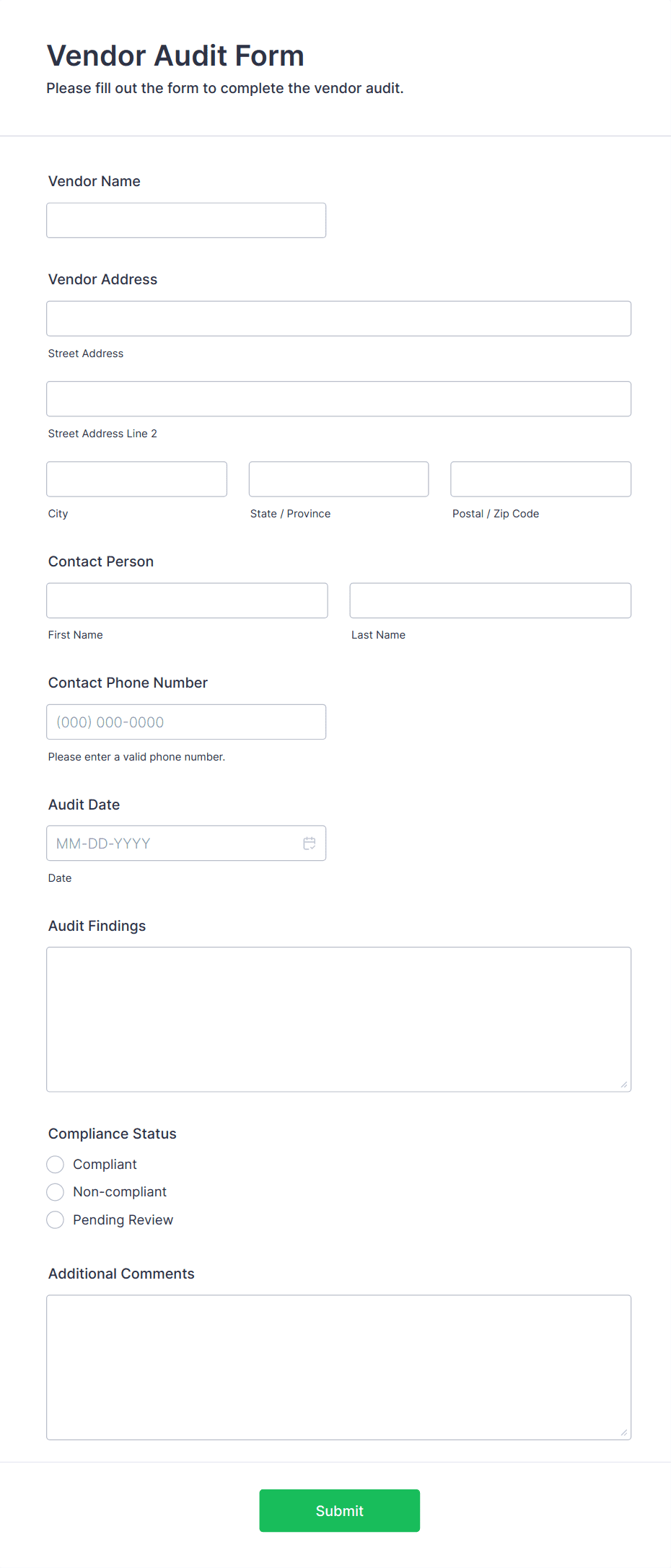 An audit form is a structured document used to systematically evaluate, inspect, or review processes, operations, or compliance within an organization. It helps standardize data collection and reporting during audits.