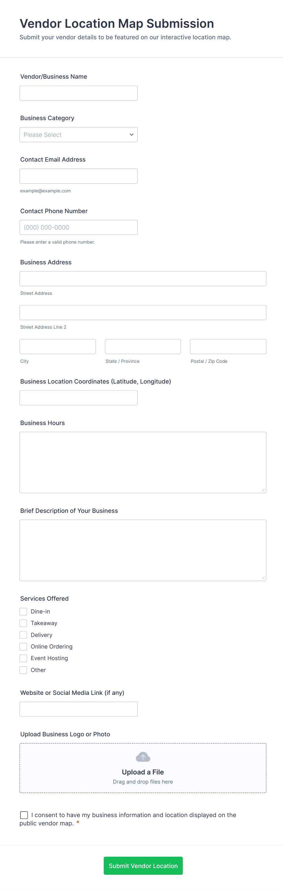 Vendor Application Form Templates are specialized online forms designed to streamline the process of onboarding new vendors, suppliers, or service providers for businesses and organizations. These templates help collect essential information such as company details, contact information, product or service offerings, certifications, compliance documents, and references. Vendor application forms are commonly used by procurement teams, event organizers, marketplaces, and retail businesses to evaluate and approve potential vendors efficiently. Whether you’re managing a large-scale event, sourcing new suppliers for your business, or running a marketplace that requires vendor vetting, these templates provide a structured and consistent way to gather and review applications.
