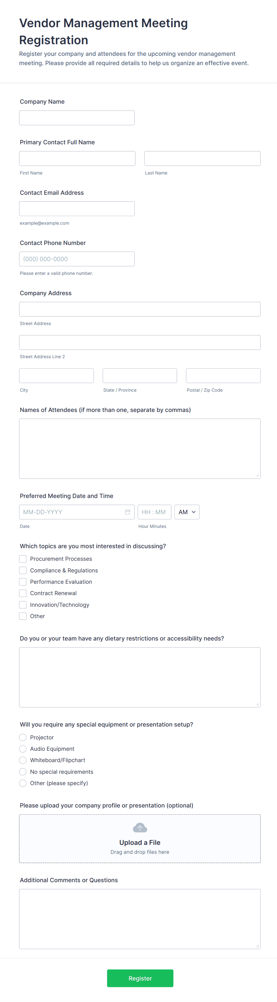 Collect vendor details and documents in one place with the Vendor KYC Registration Form by Jotform, built for procurement and finance teams to support supplier onboarding, review, and accurate data collection.
