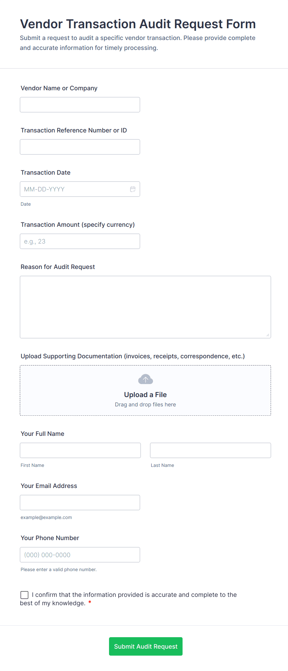 • Compliance Audits: Require fields for regulatory references, evidence collection, and sign-off sections.