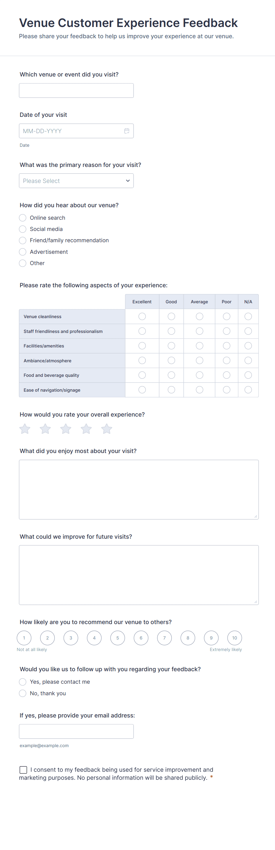 • Content and fields may vary based on event type; for example, a conference feedback form might include session ratings, while a social event form may focus on food, entertainment, and atmosphere.