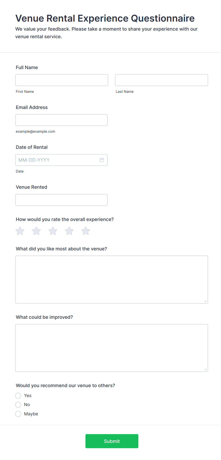 • Content and fields may vary based on event type; for example, a conference feedback form might include session ratings, while a social event form may focus on food, entertainment, and atmosphere.