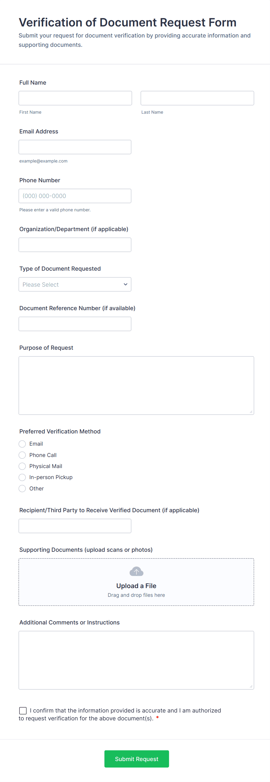 Verification forms are specialized digital tools designed to authenticate, validate, or confirm information provided by individuals or organizations. These forms are commonly used to verify identities, credentials, employment status, addresses, or other critical data points in a secure and efficient manner. Typical use cases include onboarding new employees, confirming student enrollment, validating customer identities for financial services, or ensuring the accuracy of submitted documents in compliance processes. By streamlining the verification process, these forms help organizations reduce fraud, maintain regulatory compliance, and build trust with their stakeholders.