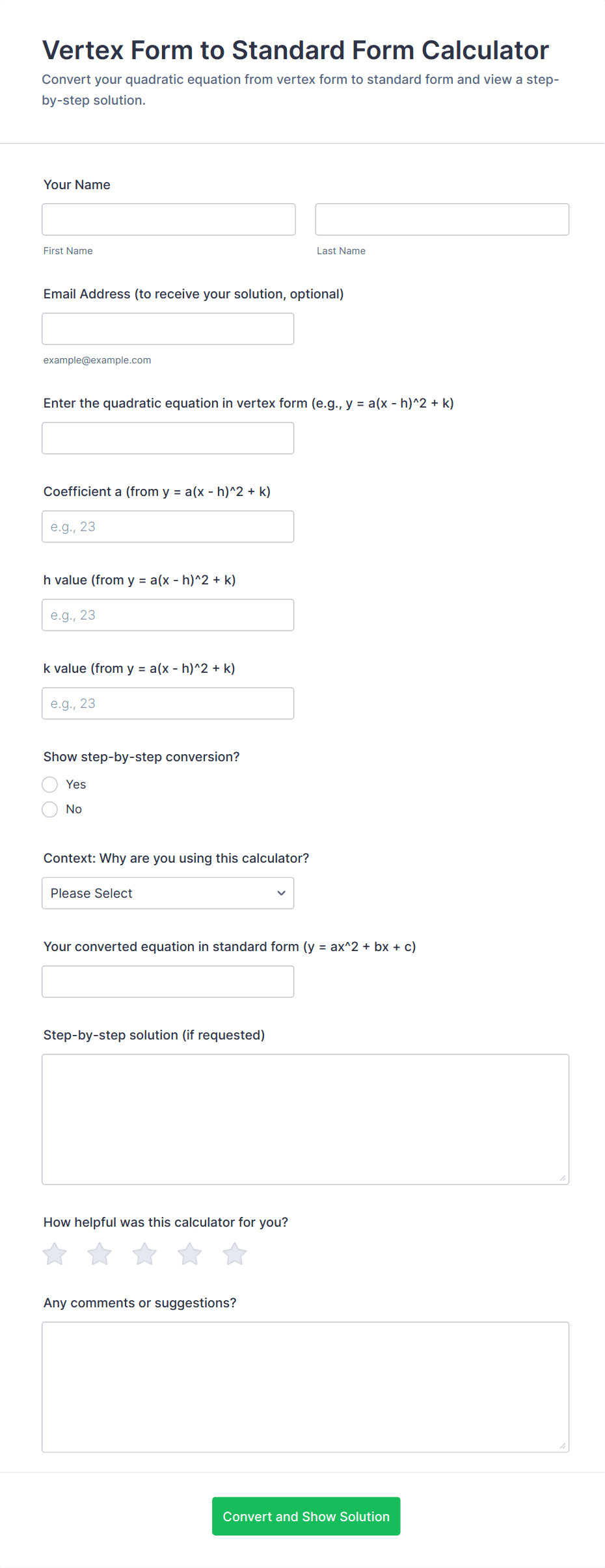 Calculation forms are specialized online forms designed to perform automatic calculations based on user input. These forms are commonly used to estimate costs, calculate totals, generate quotes, assess scores, or process any data that requires real-time mathematical operations. Typical use cases include order forms that tally product prices, loan calculators that estimate monthly payments, grade calculators for students, BMI calculators for health assessments, and budget planners for personal or business finance. Calculation forms streamline complex processes by providing instant results, reducing manual errors, and enhancing user experience.