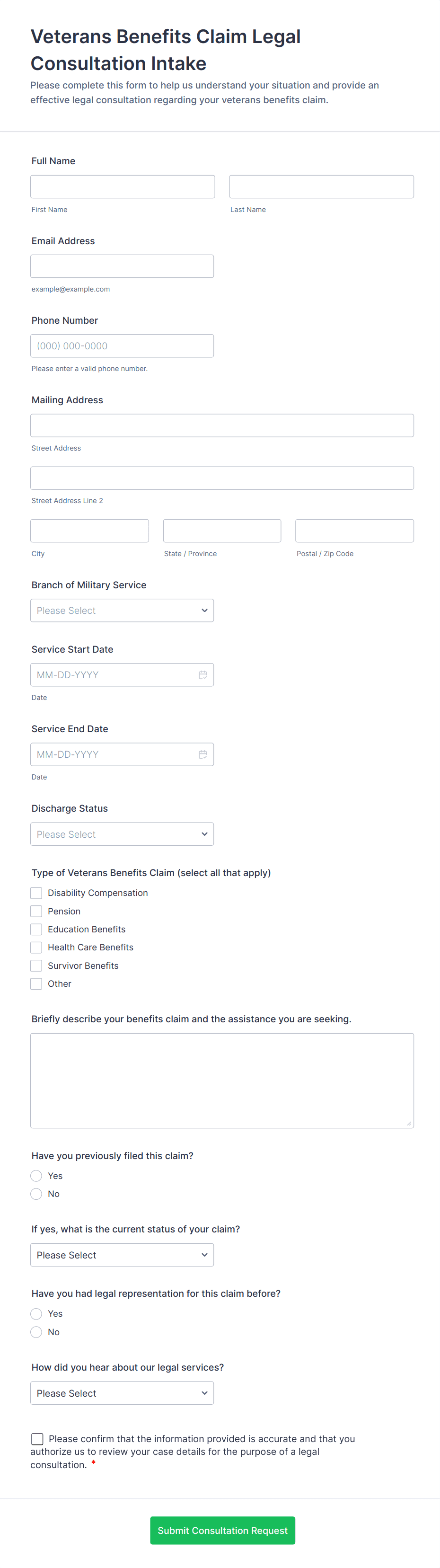 Optimize your professional services using web forms as your intake form to receive legal concerns and close future agreements with web-based walk-ins. Use this Legal Client Intake Form template and never miss a client anymore.