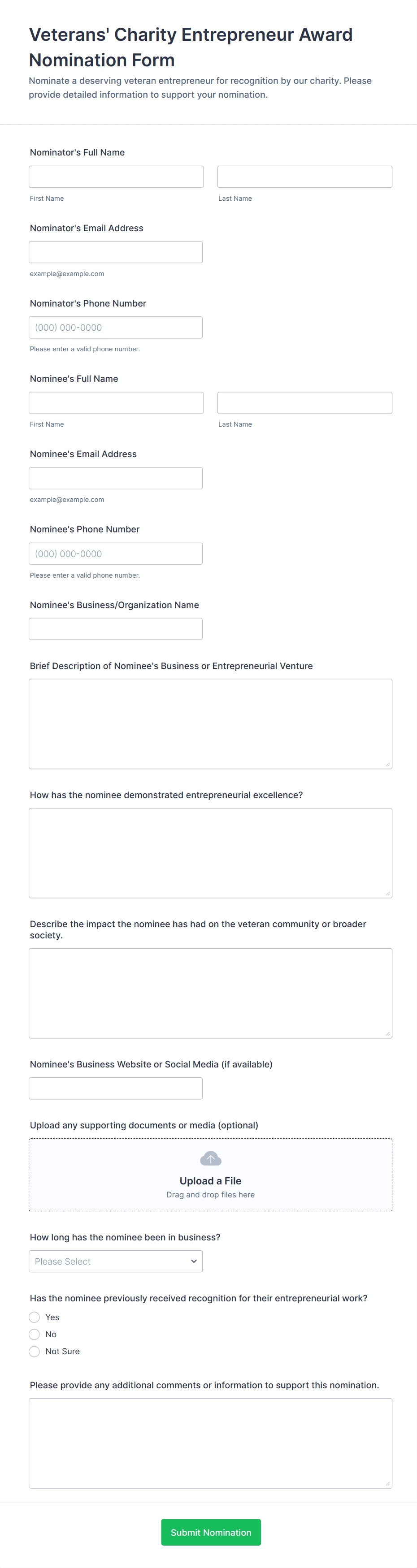 Collect nominee name, role or affiliation, and contact details if needed. Add nominator details and relationship to nominee.
