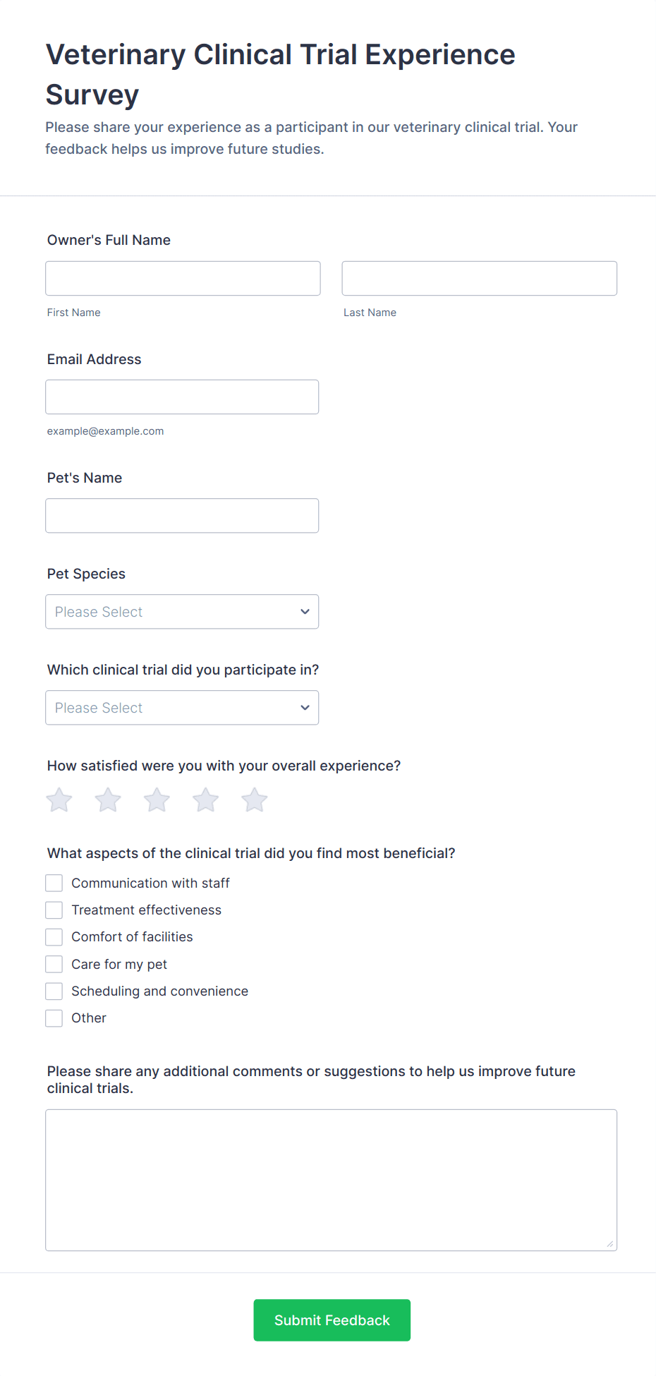 Veterinary Appointment Form Template helps clinics and animal care providers schedule pet visits and collect basic animal details online.