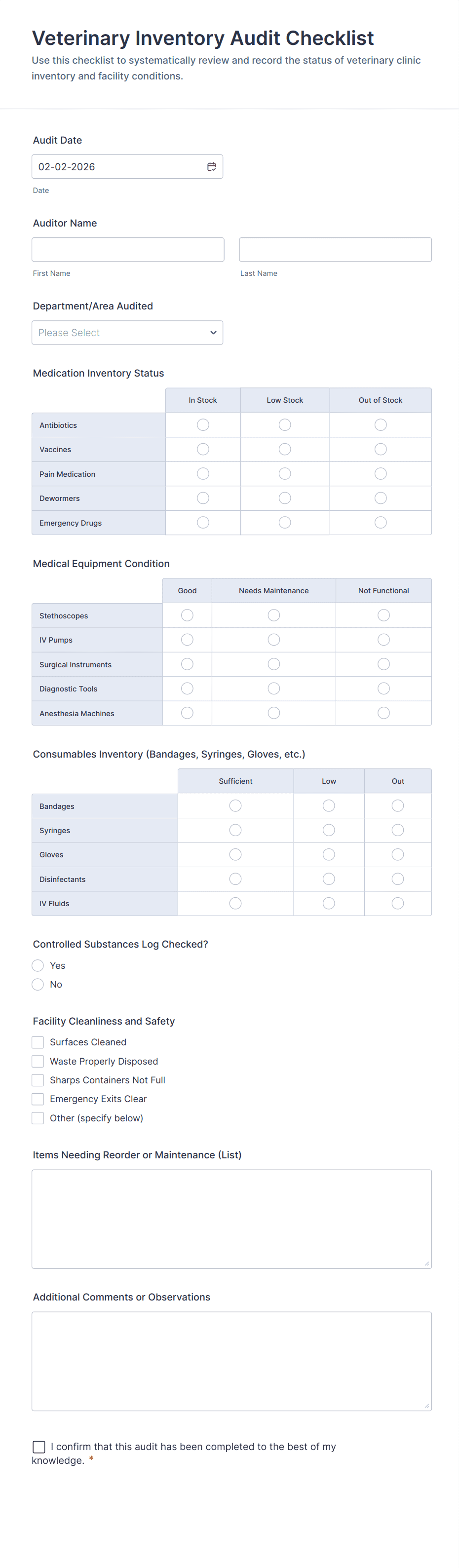 • For more complex checklists, add dropdowns, file upload fields (for attaching evidence or reports), or signature fields (for verification).