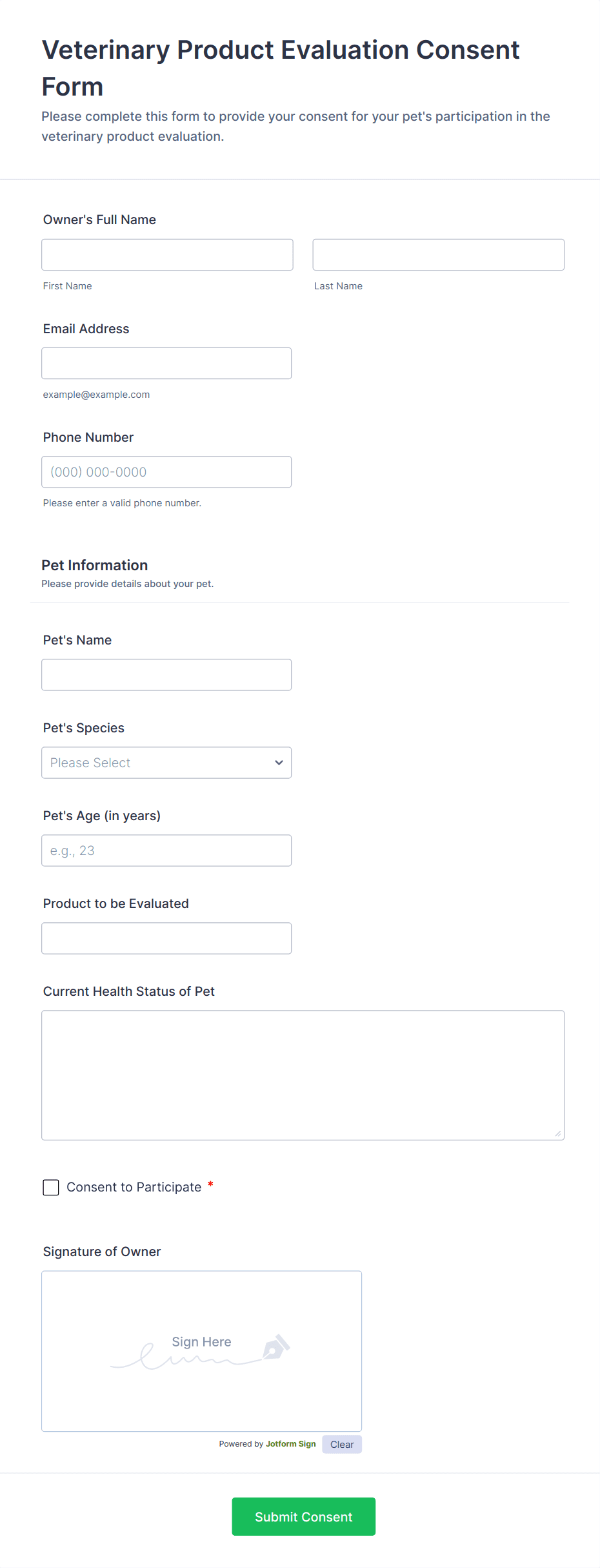 Use this Pet Boarding Waiver and Consent Form template where pet owners can sign which confirms that they agree to the terms and conditions. Using the Form Builder, you can edit and modify the paragraph consent based on the policies of your company.