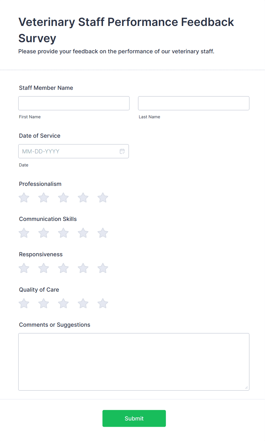 Veterinary Appointment Form Template helps clinics and animal care providers schedule pet visits and collect basic animal details online.