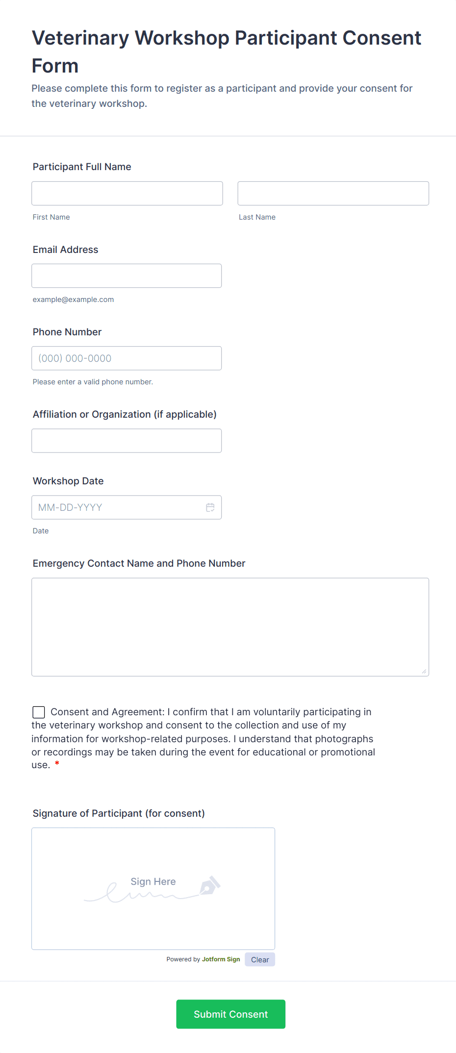 Jotform ensures data is securely stored and can include consent fields to comply with privacy regulations and obtain necessary permissions from clients.