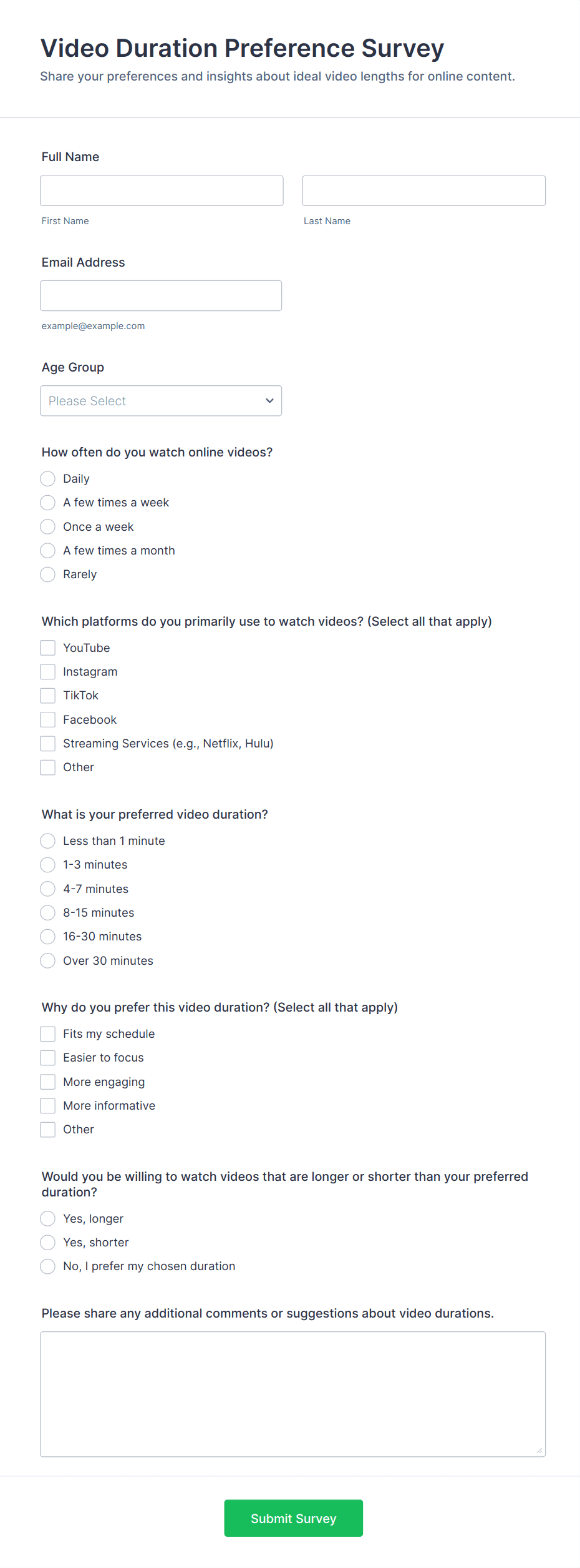 • Market Research Surveys: Incorporate demographic questions, purchasing behavior, and competitor analysis.