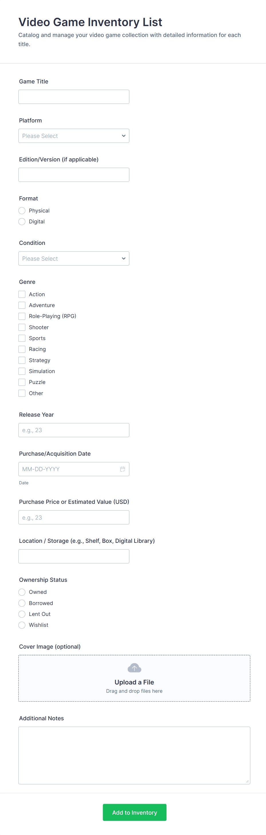 • Inventory Tracking: Forms may include fields for item name, SKU, quantity, location, and restock dates.