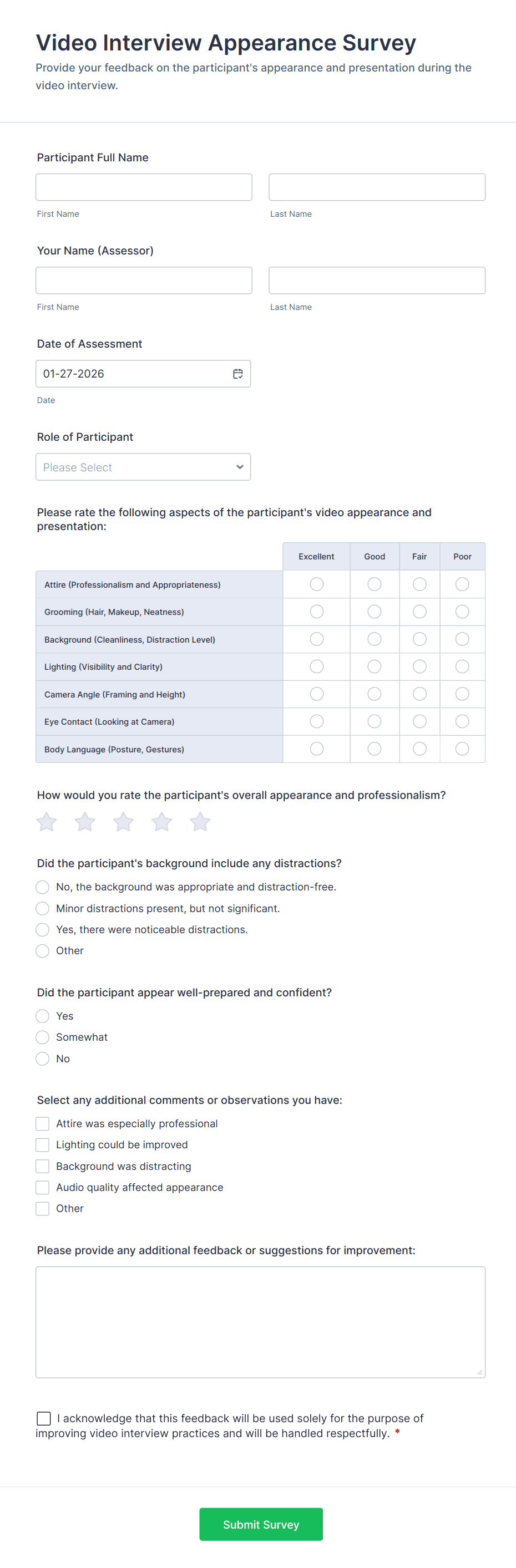 The Remote Job Interview Form helps HR professionals collect essential candidate information for remote interviews, streamlining the hiring process and improving data collection.