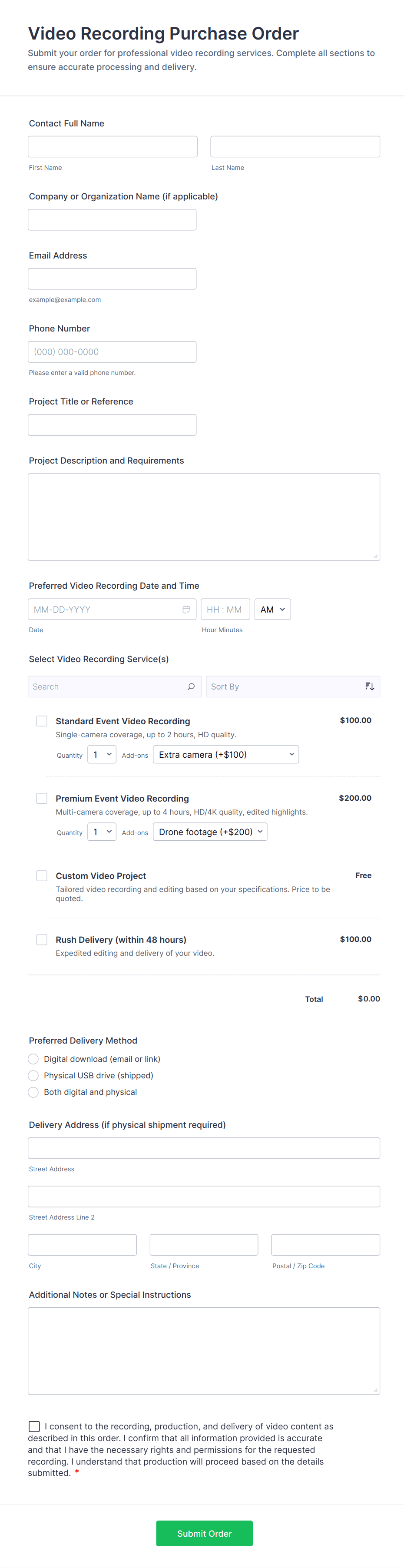 Purchase order forms can be adapted to a variety of business scenarios, each with its own requirements and benefits. Here’s how they address different needs and how their structure may vary:
