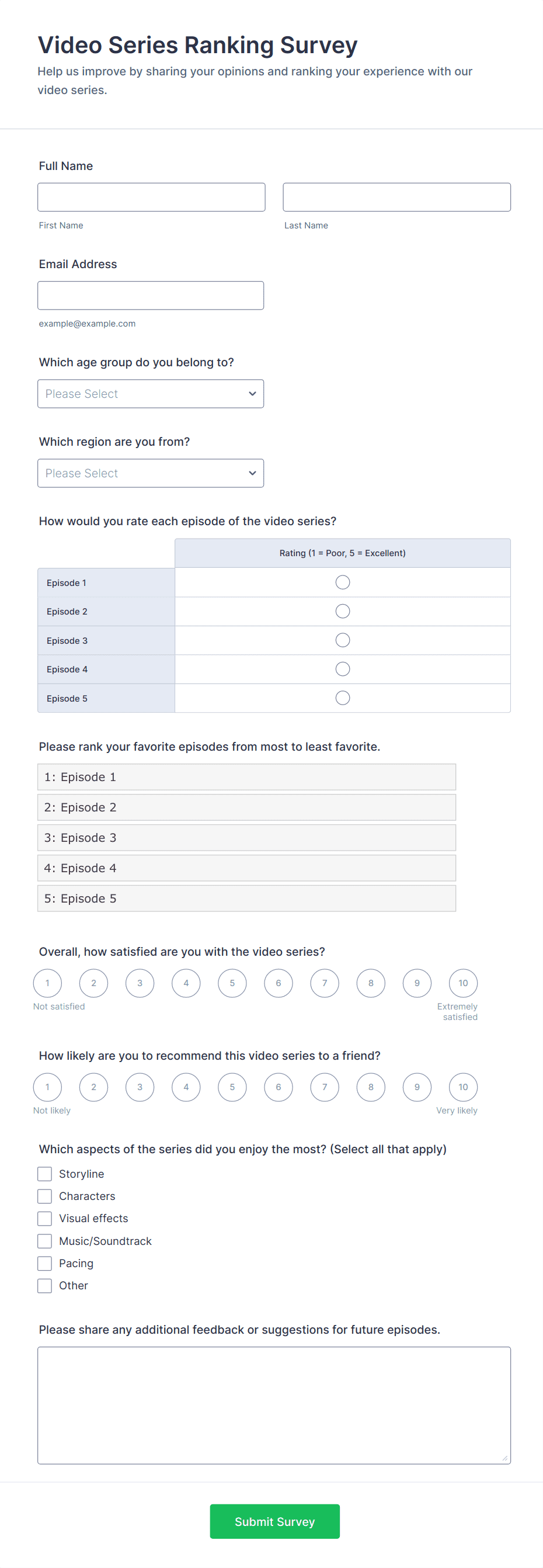 • Content and fields vary by use case: customer surveys may focus on satisfaction and likelihood to recommend, while employee surveys might include questions about workplace culture and management.
