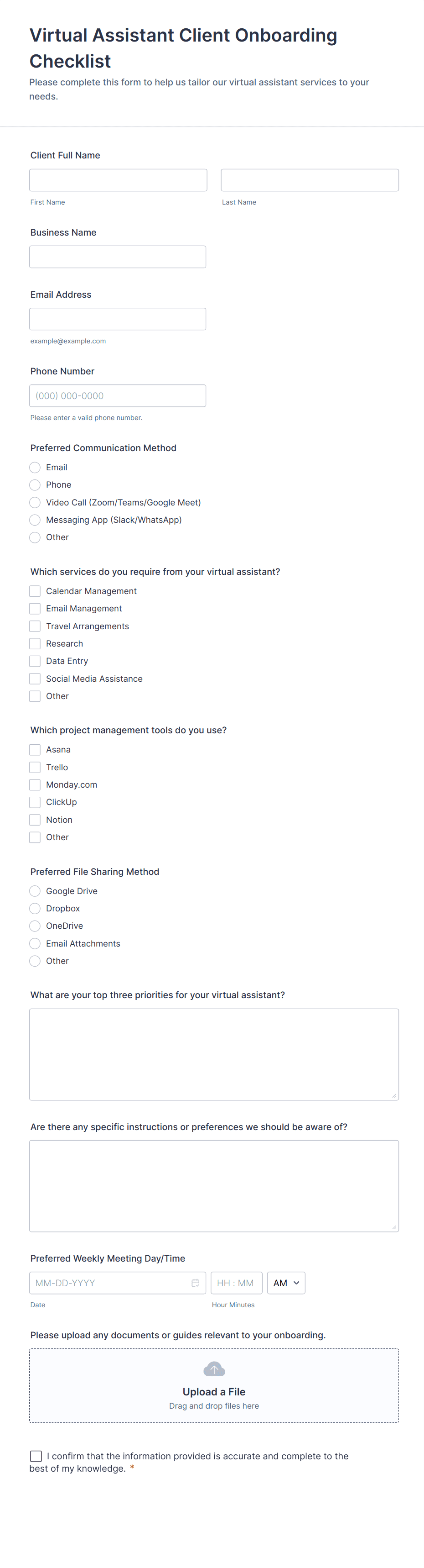 Onboarding Form Templates are specialized digital forms designed to streamline the process of integrating new employees, clients, students, or members into an organization or program. These templates help collect essential information, set expectations, and ensure a smooth transition for newcomers. Common use cases include employee onboarding, client intake, volunteer registration, student enrollment, and vendor onboarding. By standardizing the onboarding process, these forms help organizations gather necessary data, provide important resources, and establish clear communication from the very beginning.