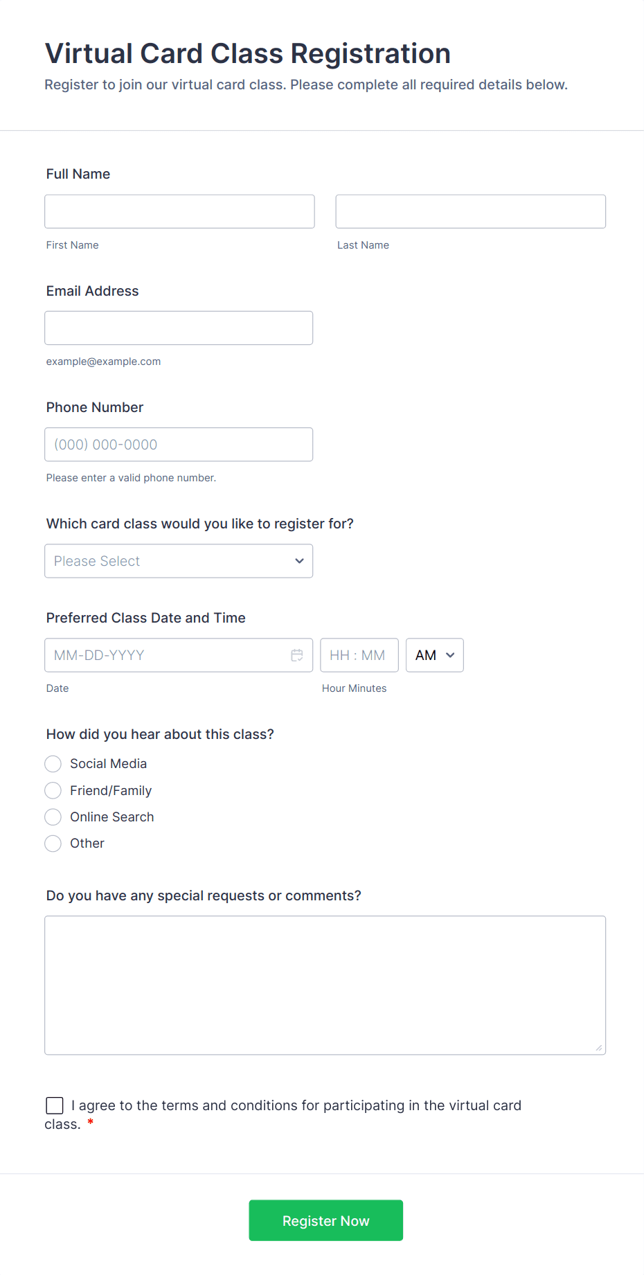 Workshop Registration Form Templates are specialized online forms designed to streamline the process of enrolling participants in workshops, seminars, training sessions, and educational events. These templates help organizers efficiently collect essential attendee information such as names, contact details, session preferences, payment details, and special requirements. Whether you’re hosting a hands-on art class, a professional development seminar, or a multi-day technical workshop, these forms can be tailored to fit the unique needs of your event. Use cases range from small community workshops to large-scale industry conferences, making them versatile tools for educators, trainers, event planners, and organizations of all sizes.