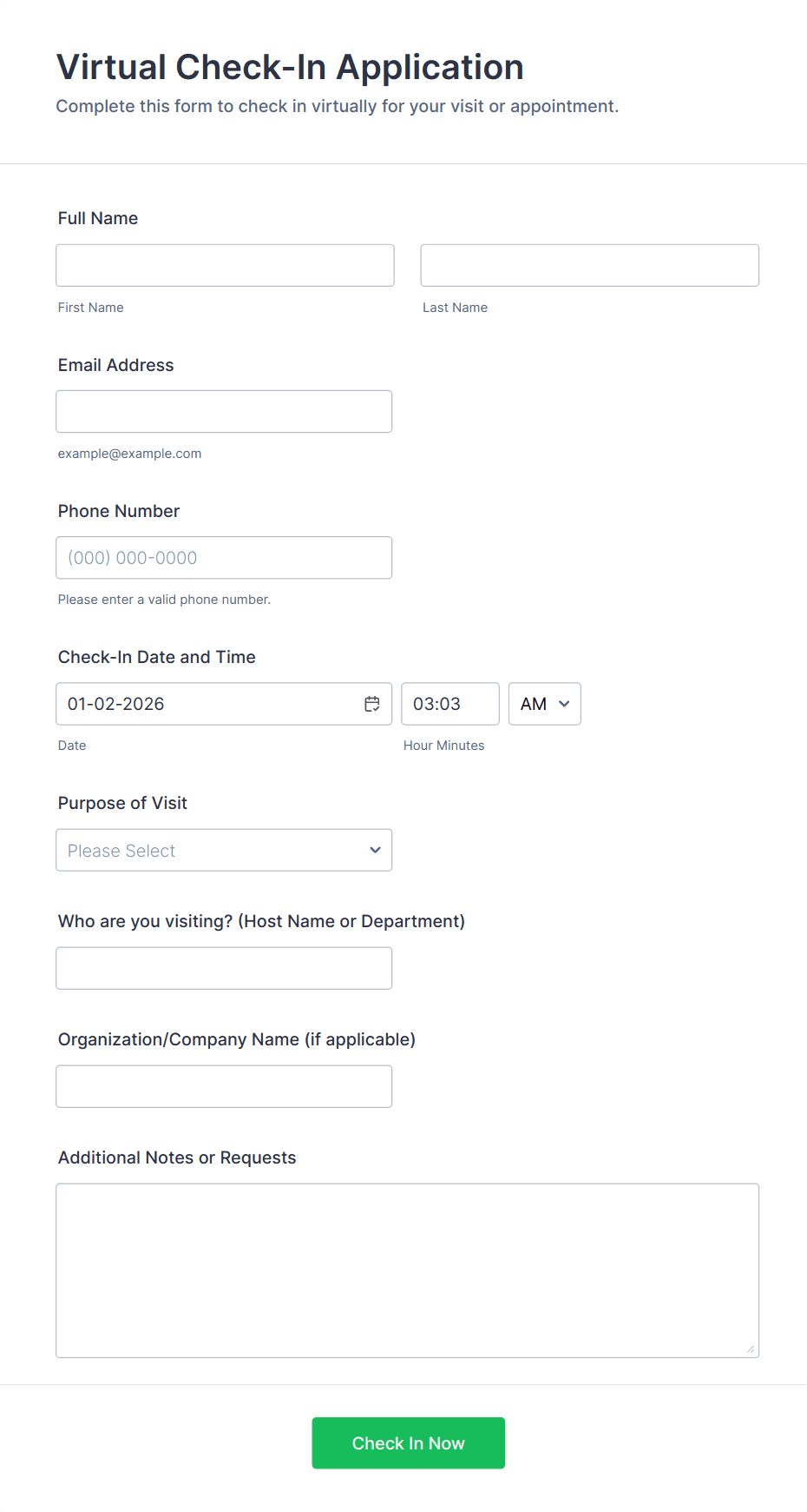 - Specialized Fields: Company/organization, reason for visit, or appointment details.