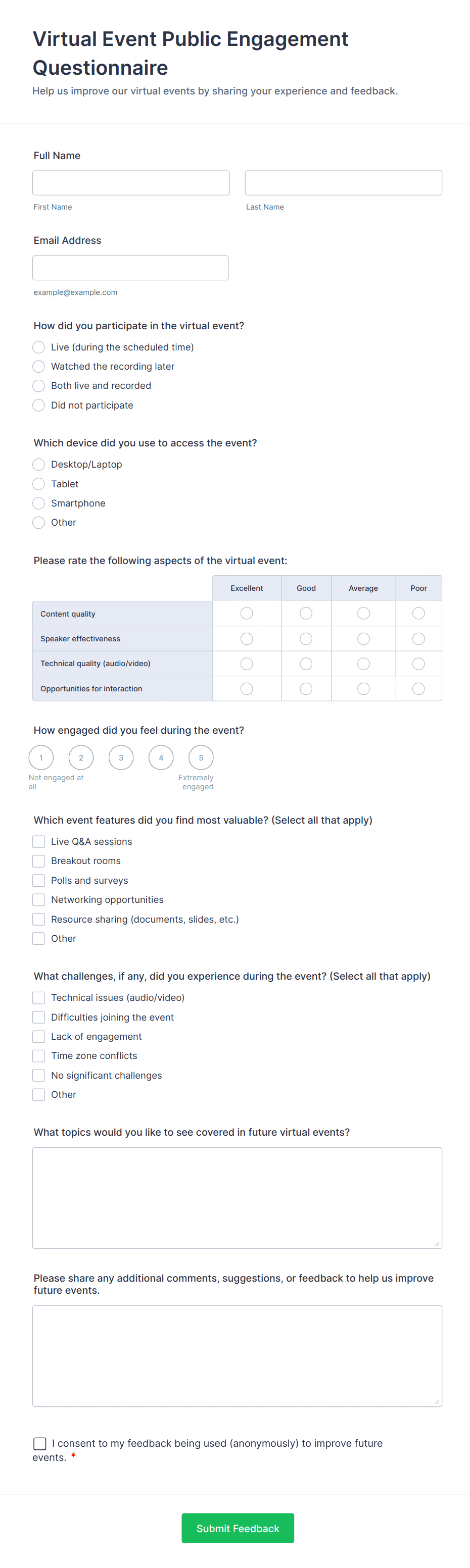 Virtual Event Forms are specialized online forms designed to streamline the planning, management, and execution of virtual events such as webinars, online conferences, workshops, networking sessions, and virtual expos. These forms can be used for a variety of purposes, including attendee registration, session sign-ups, feedback collection, speaker applications, sponsorship inquiries, and post-event surveys. By digitizing the data collection process, Virtual Event Forms help organizers efficiently gather essential information, manage participant lists, and ensure smooth communication before, during, and after the event.