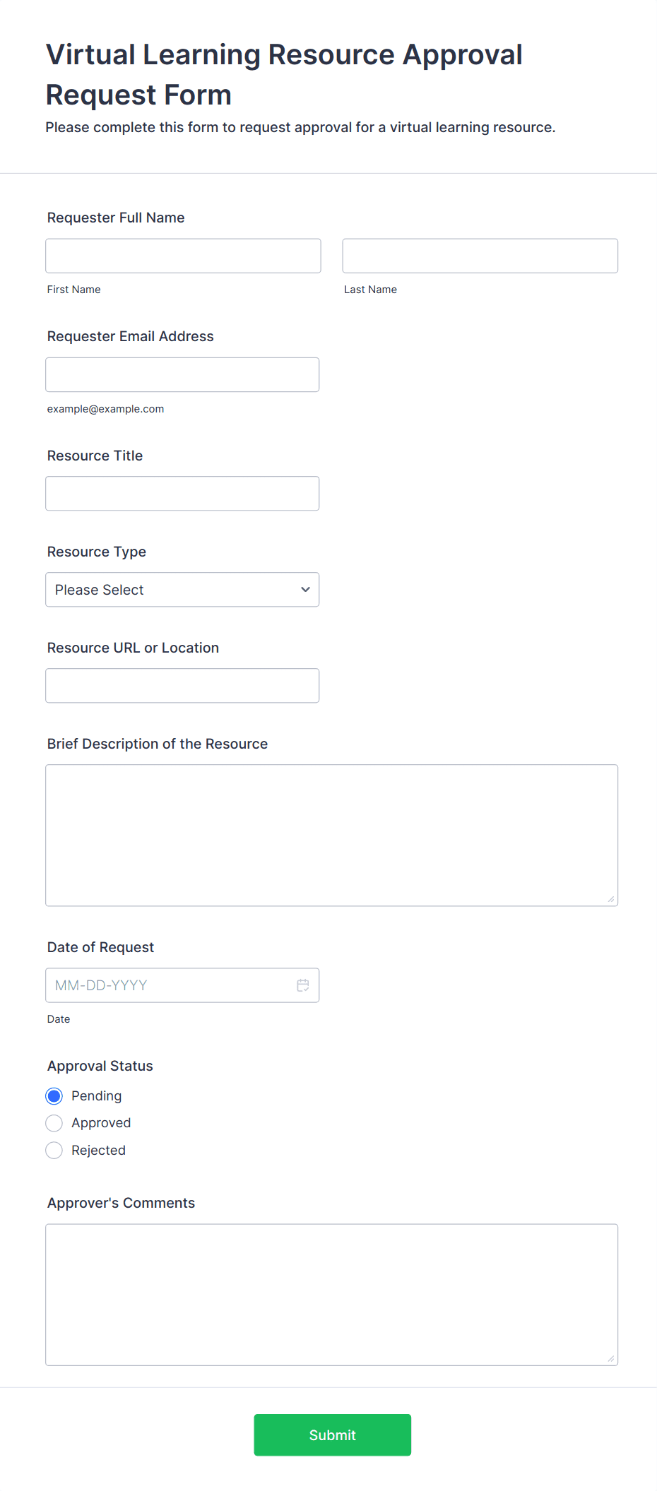 Approval Form Templates are specialized online forms designed to streamline and automate the process of requesting, reviewing, and granting approvals for a wide range of business and organizational needs. These templates are commonly used for leave requests, purchase orders, expense reimbursements, project proposals, document sign-offs, and more. By providing a structured workflow, approval forms ensure that requests are routed to the appropriate decision-makers, tracked efficiently, and documented for compliance and transparency. Whether you’re managing internal HR processes, procurement, or project management, approval forms help standardize and accelerate decision-making.