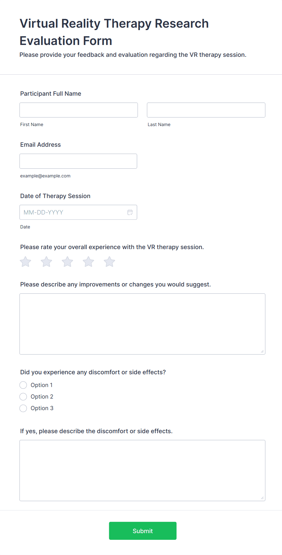 Medical surveys and questionnaires are essential tools used by healthcare professionals, researchers, clinics, and organizations to collect valuable information about patients’ health, medical histories, symptoms, treatment outcomes, and overall well-being. These forms can be used for a variety of purposes, such as patient intake, health risk assessments, satisfaction surveys, mental health screenings, post-visit feedback, and clinical research studies. By gathering structured data directly from patients or study participants, medical surveys and questionnaires help streamline workflows, improve patient care, and support evidence-based decision-making in healthcare settings.