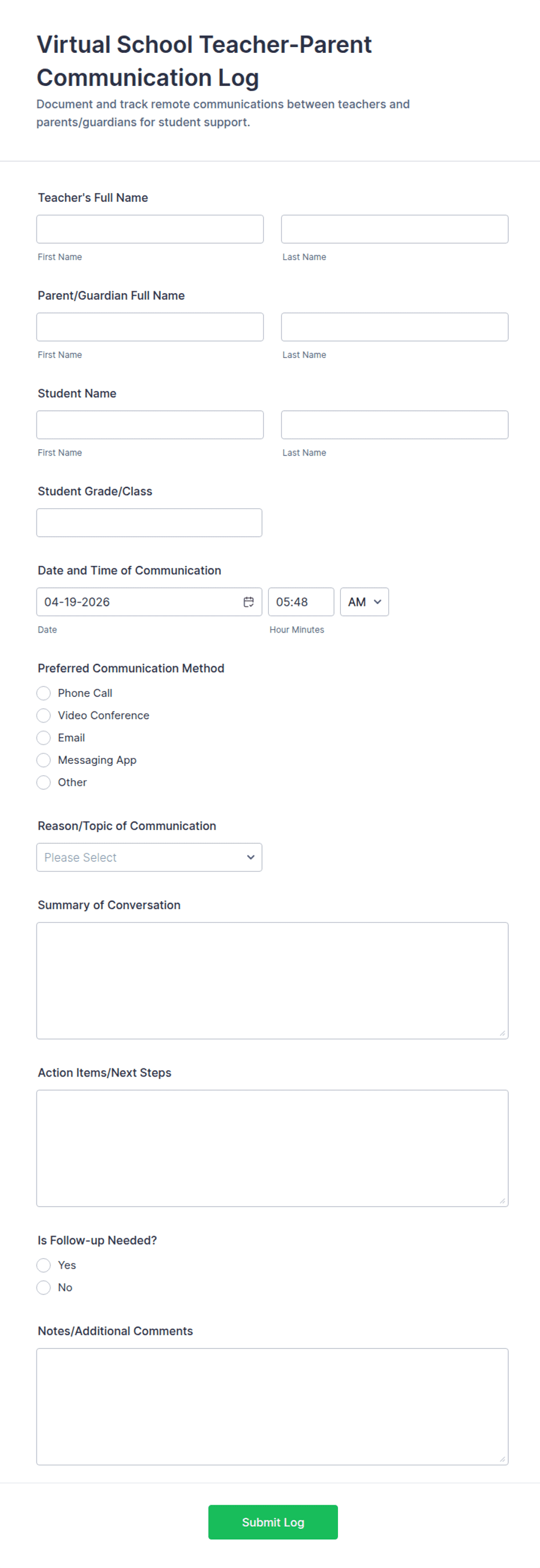 Use it after progress updates, attendance check-ins, behavior conversations, learning support discussions, or any time staff need a consistent record of outreach and follow-up during the school year.