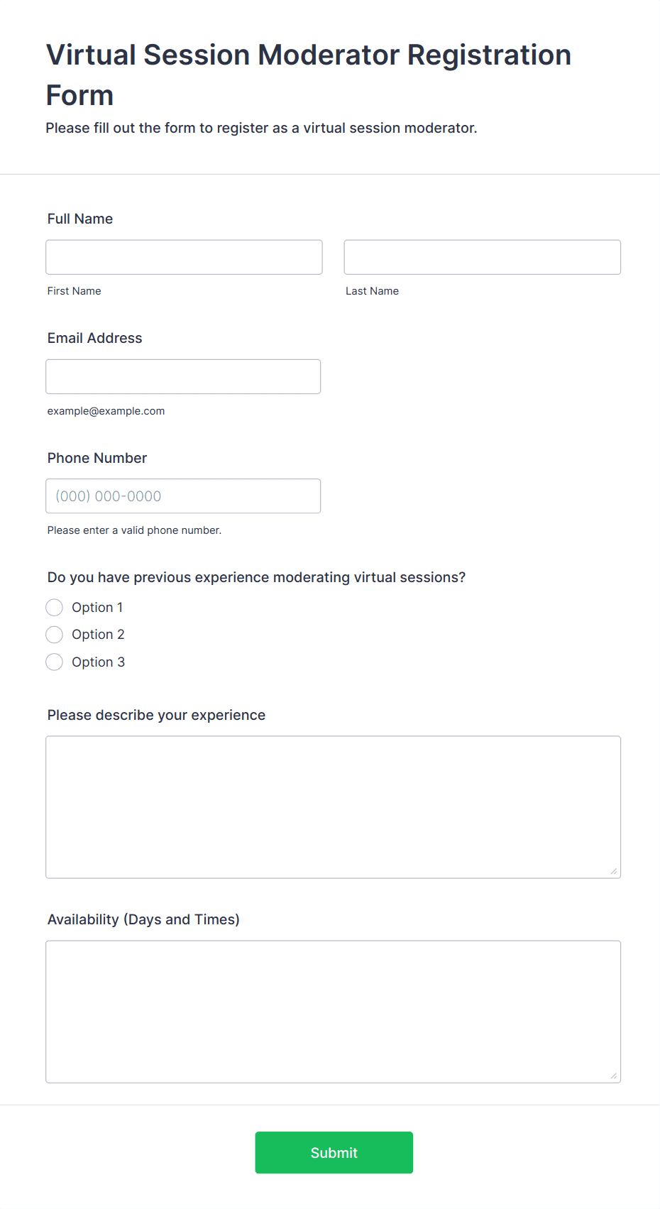 Virtual Event Forms are specialized online forms designed to streamline the planning, management, and execution of virtual events such as webinars, online conferences, workshops, networking sessions, and virtual expos. These forms can be used for a variety of purposes, including attendee registration, session sign-ups, feedback collection, speaker applications, sponsorship inquiries, and post-event surveys. By digitizing the data collection process, Virtual Event Forms help organizers efficiently gather essential information, manage participant lists, and ensure smooth communication before, during, and after the event.