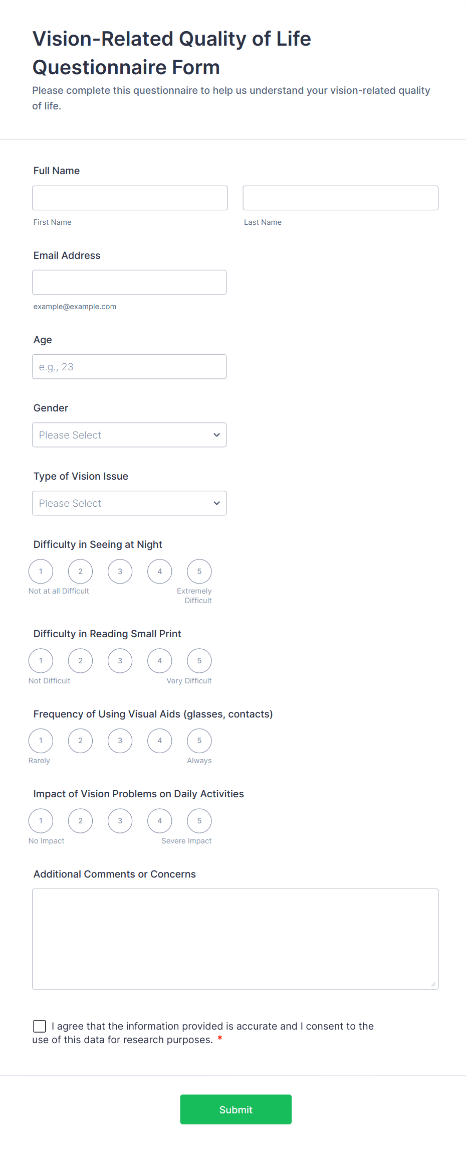 • Research Questionnaires: Require consent forms, demographic data, and study-specific queries.