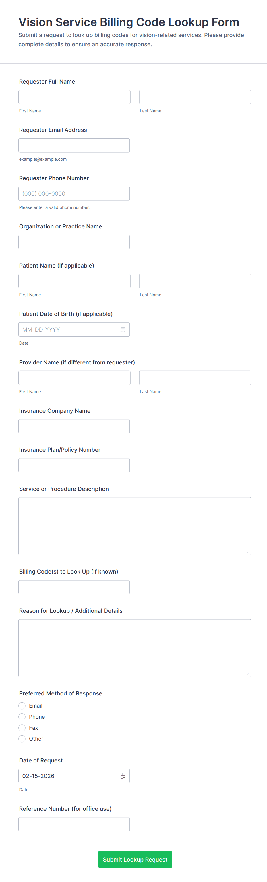 It is used to collect the information a billing or coding team needs to research vision service billing codes and respond to staff with accurate guidance for claims, corrections, or pre-billing checks.