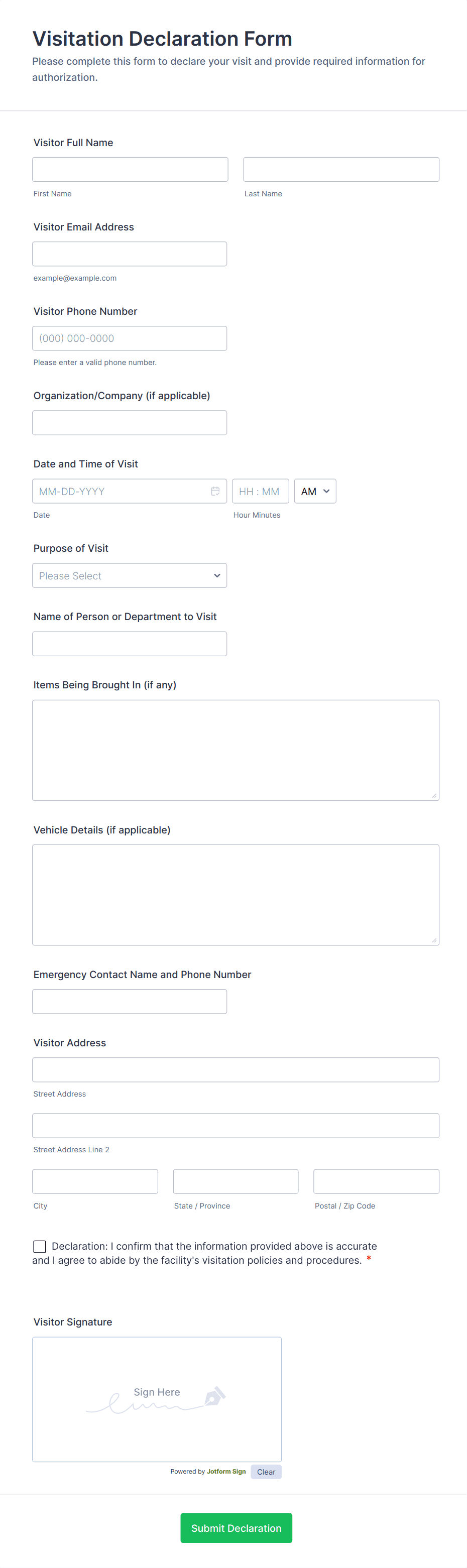 The form templates here are for informational purposes only. Jotform is not providing legal, financial, or other advice, or implying that the forms are legally valid in all or any jurisdictions. Before using any such form, consult an attorney and/or other applicable professionals to make sure that the form meets your needs, legally and otherwise.