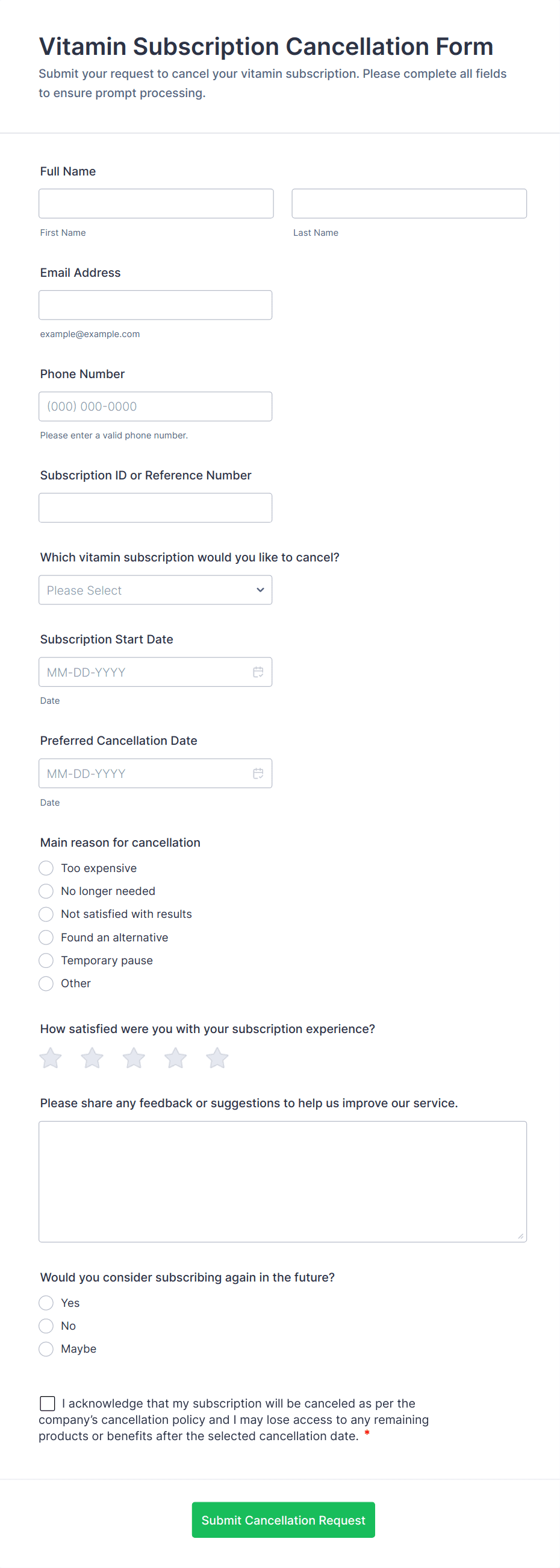 Common fields include the user’s name, contact information, account or membership number, reason for cancellation, date of last service, and any feedback or comments.