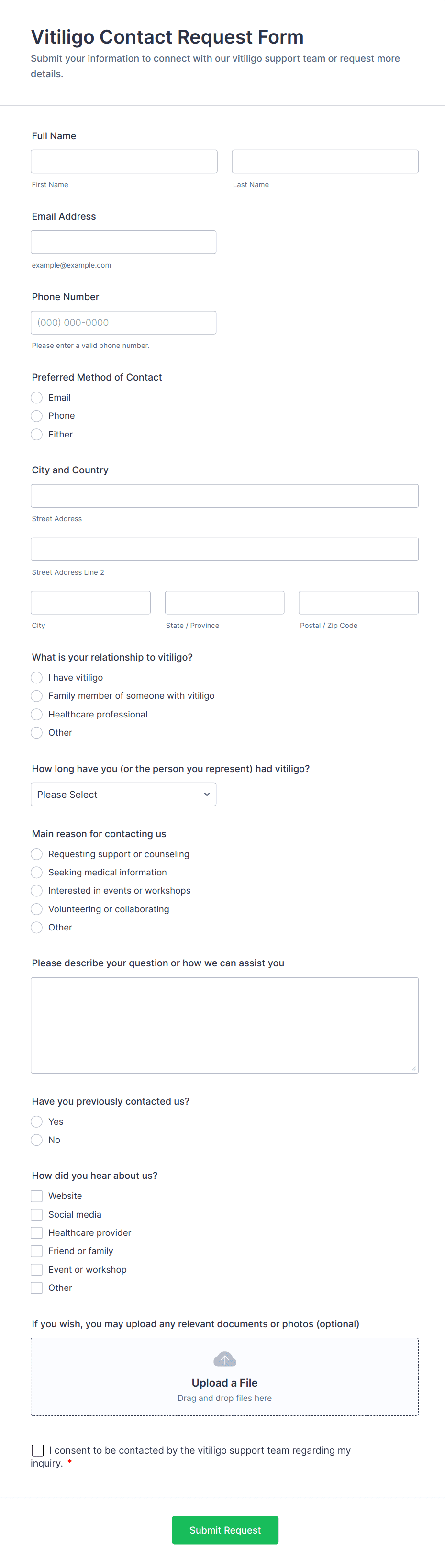 - For specialized use cases, include dropdowns (e.g., inquiry type), checkboxes (e.g., preferred contact method), or file upload fields (for attachments or screenshots).