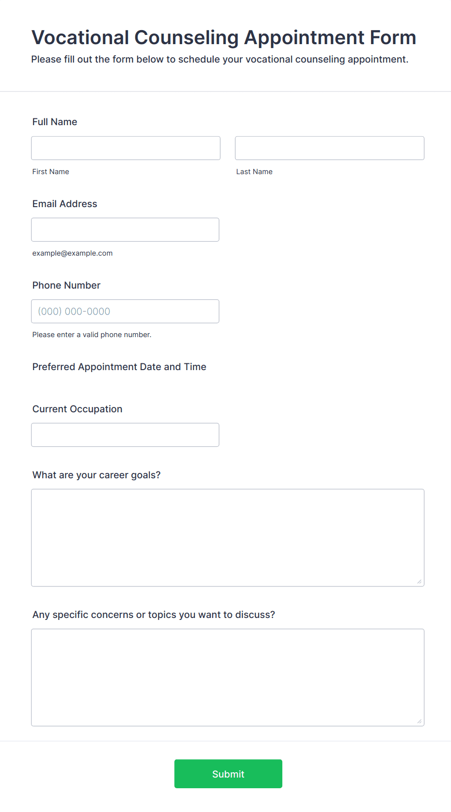 Appointment forms are digital tools designed to streamline the process of scheduling meetings, consultations, interviews, or any type of appointment between service providers and clients. These forms are commonly used by healthcare professionals, salons, educational institutions, consultants, and businesses that require organized time management for their services. By collecting essential information such as preferred dates, times, contact details, and specific service requests, appointment forms help reduce scheduling conflicts, minimize no-shows, and improve overall efficiency. Whether you’re managing a busy clinic, coordinating interviews, or booking personal training sessions, appointment forms provide a structured way to handle bookings and keep your calendar organized.