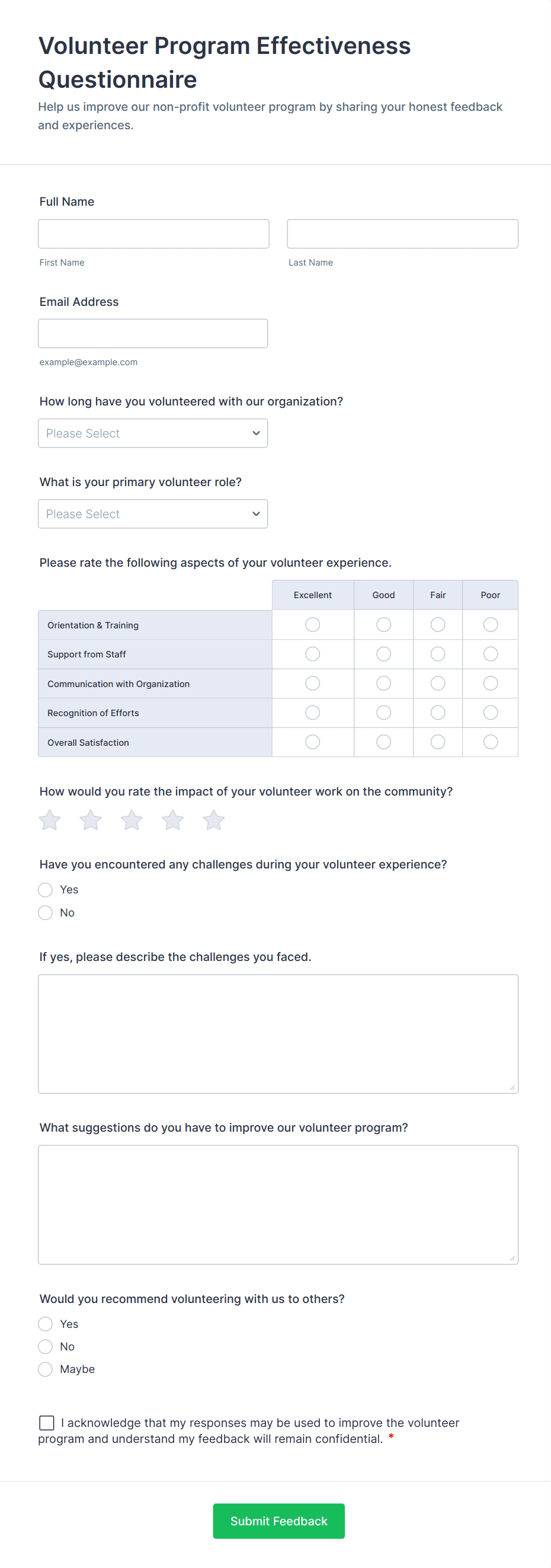 - Content and fields differ based on the objective: e.g., a health screening questionnaire may include medical history and symptom checklists, while a customer feedback form focuses on satisfaction ratings and open-ended comments.