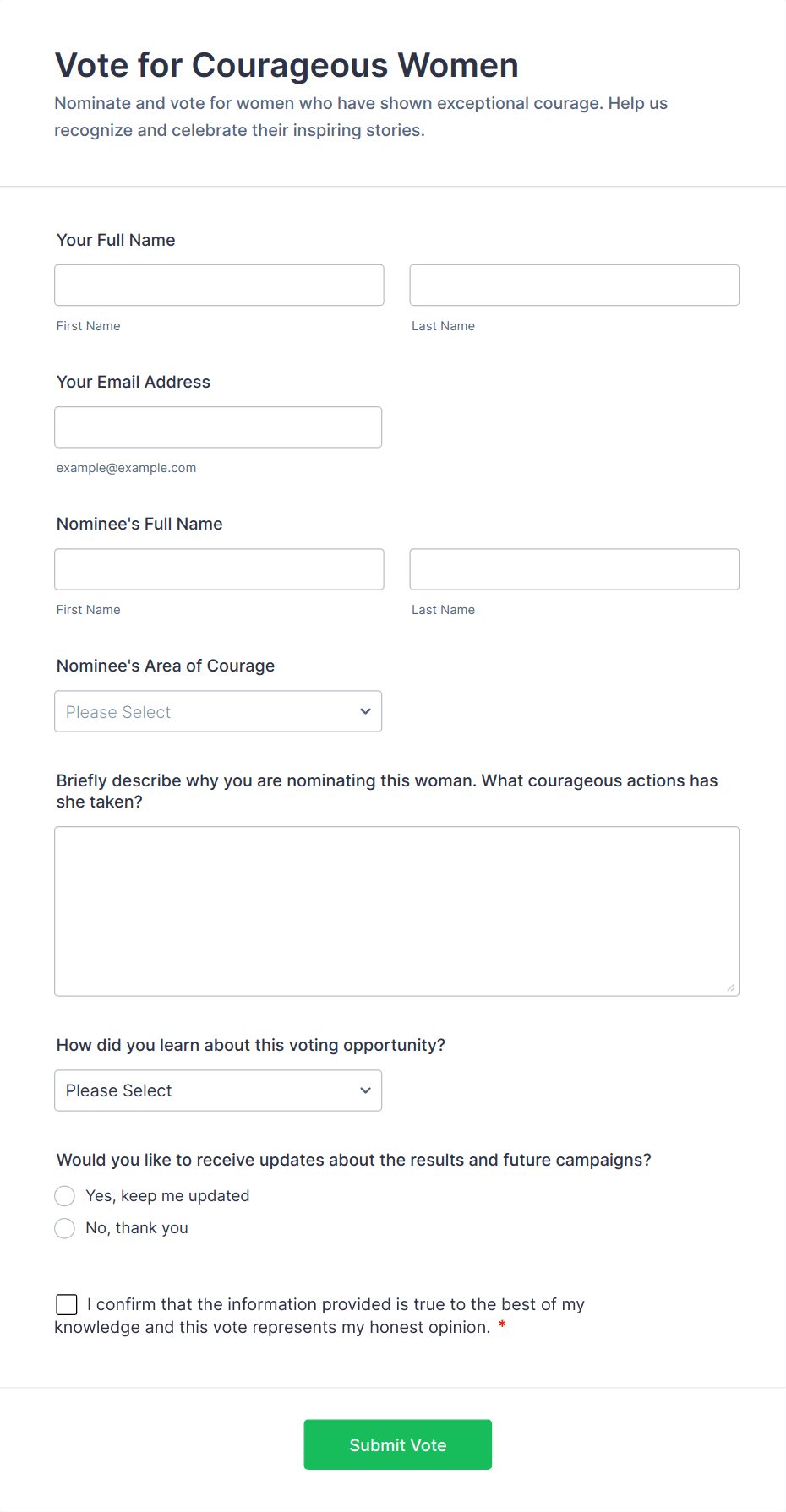 Voting forms are digital tools designed to collect, organize, and analyze votes or preferences from a group of participants. They are commonly used for elections, polls, surveys, award nominations, event planning, and decision-making processes in organizations, schools, clubs, and communities. Voting forms streamline the process of gathering input, whether it’s for selecting a new team leader, choosing a favorite project, or making group decisions efficiently. Their versatility makes them suitable for both formal elections and informal opinion polls, ensuring that every participant’s voice is heard and recorded accurately.