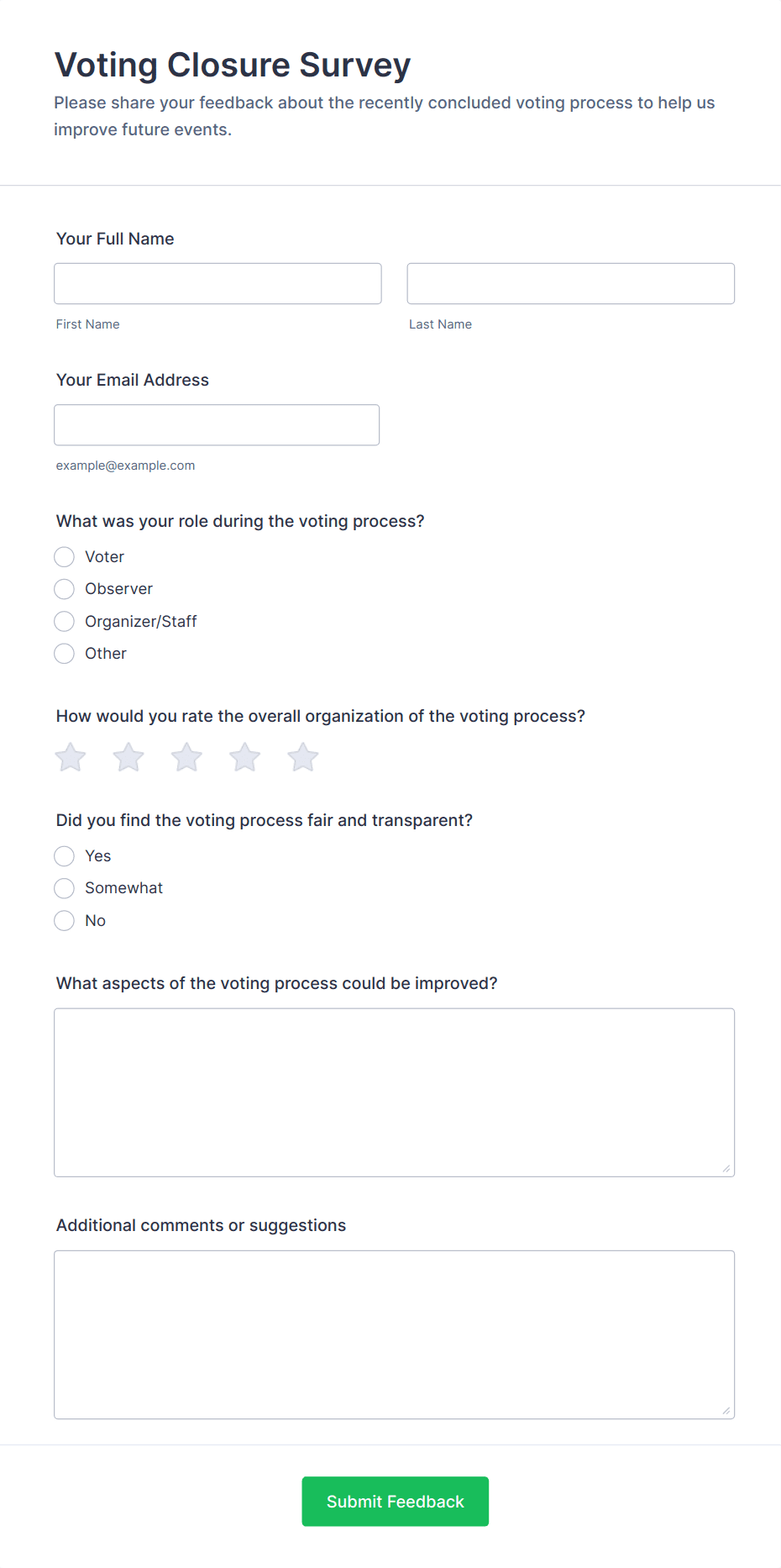 Voting forms are used by schools, businesses, clubs, nonprofits, event organizers, and any group needing to make collective decisions or gather opinions.