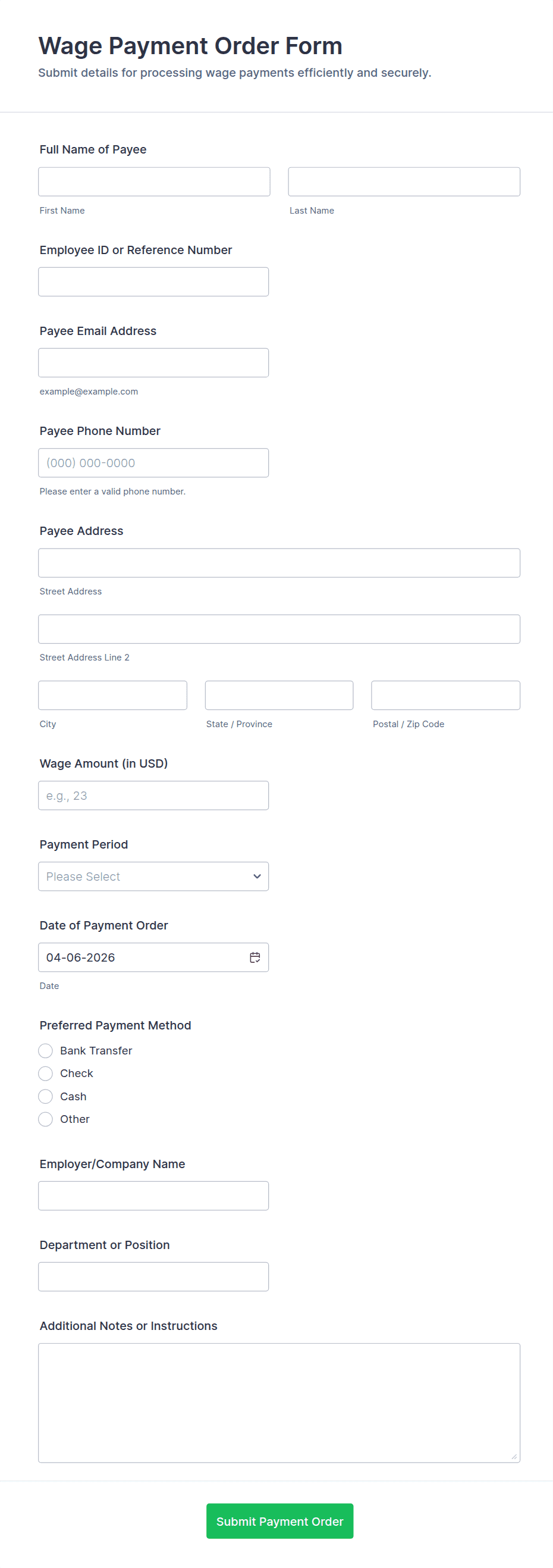 Payment forms are specialized online forms designed to securely collect payments, donations, fees, or orders from customers, clients, or donors. These forms are commonly used by businesses, nonprofits, educational institutions, and service providers to facilitate transactions such as product sales, event registrations, membership fees, or charitable contributions. Payment forms streamline the payment process by allowing users to enter their payment details directly on the form, often integrating with popular payment gateways like PayPal, Stripe, or Square. This eliminates the need for manual invoicing or offline payment collection, making transactions faster and more convenient for both parties.
