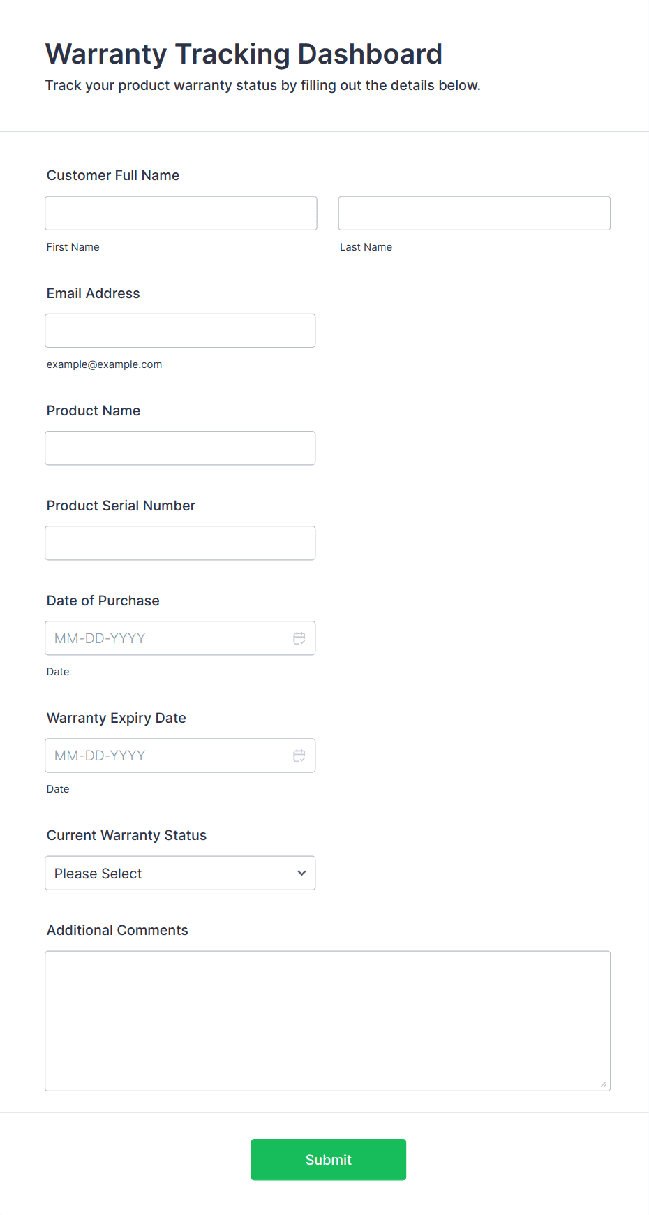 Tracking forms are specialized digital tools designed to help individuals and organizations monitor, record, and manage various types of data over time. These forms can be used for a wide range of purposes, such as tracking inventory, employee attendance, project progress, expenses, shipments, maintenance schedules, and more. By providing a structured way to capture and organize information, tracking forms streamline data collection and make it easier to analyze trends, identify issues, and ensure accountability. Whether you’re a business owner monitoring sales leads, a teacher tracking student assignments, or a healthcare provider recording patient symptoms, tracking forms offer a flexible solution for staying organized and informed.