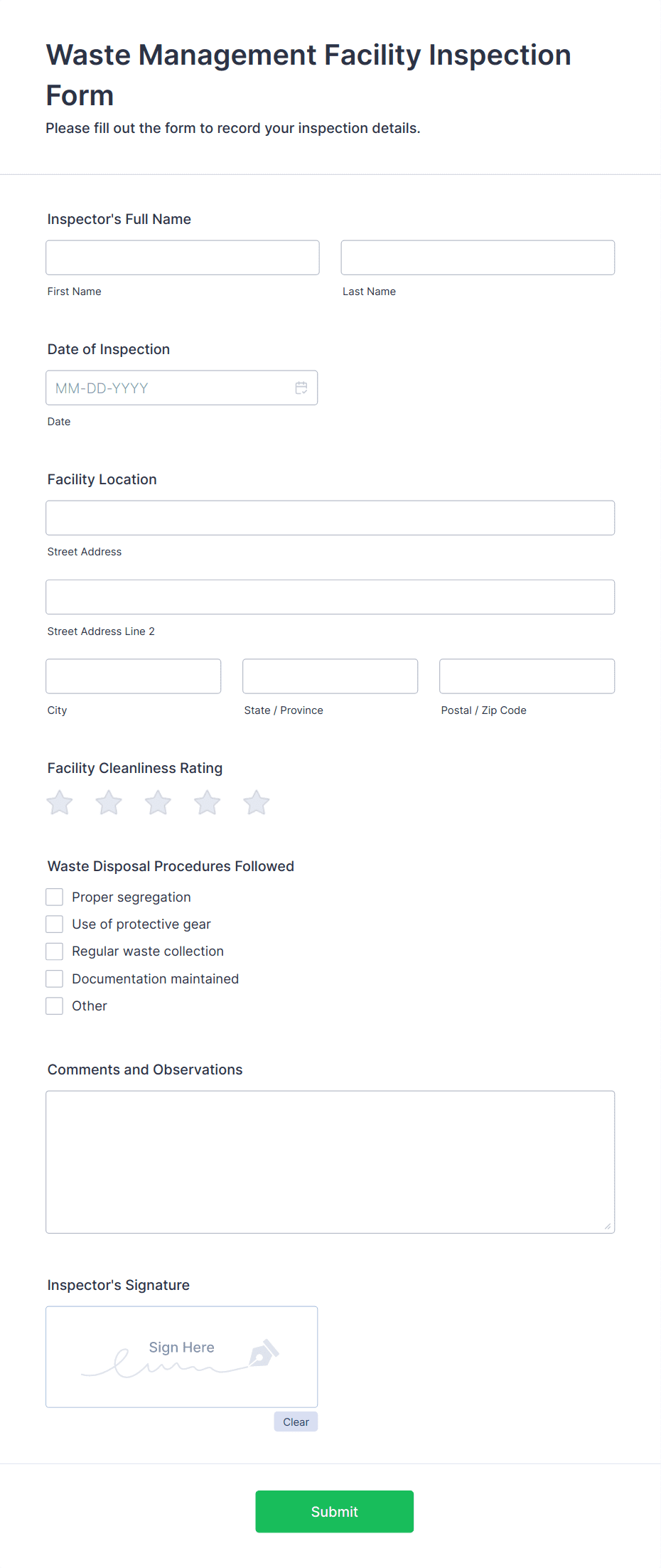 An inspection form is a structured document used to assess, record, and report the condition, compliance, or quality of assets, environments, or processes during an inspection.