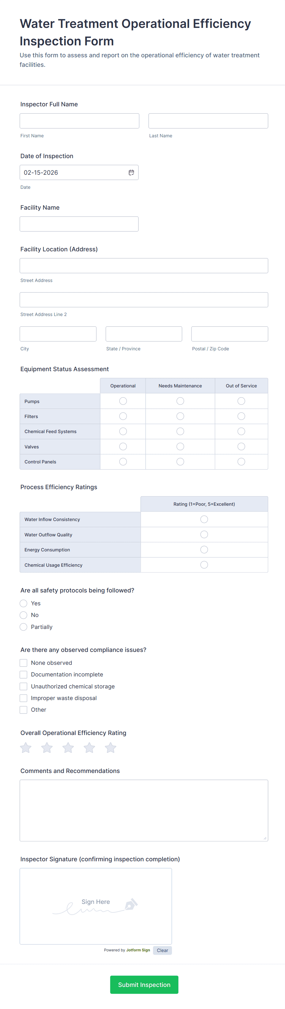 An inspection form is a structured document used to assess, record, and report the condition, compliance, or quality of assets, environments, or processes during an inspection.